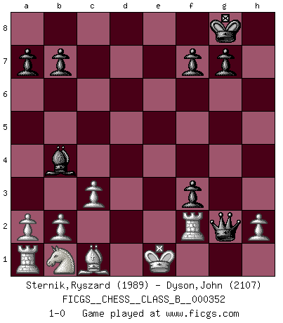 Last move : 1-0 2022 July 18 14:41:7 [Event "FICGS__CHESS__CLASS_B__000352"] [Site "FICGS"] [Date "2022.02.19"] [Round "1"] [White "Sternik,Ryszard"] [Black "Dyson,John"] [Result "1-0"] [WhiteElo "1989"] [BlackElo "2107"] 1.e4 e5 2.f4 d5 3.exd5 exf4 4.Nf3 Nf6 5.Bb5+ c6 6.dxc6 Nxc6 7.d4 Bd6 8.Qe2+ Be6 9.Ng5 O-O 10.Nxe6 Qb6 11.Nxf8 Nxd4 12.Nxh7 Bb4+ 13.c3 Nxe2 14.Nxf6+ Qxf6 15.Bxe2 Re8 16.Kd1 Rxe2 17.Kxe2 Qe6+ 18.Kd1 Qg4+ 19.Ke1 Qxg2 20.Rf1 f3 21.Rf2 1-0 KGD : Falkbeer counter-gambit Kingside Castling by player Black (move 9) Player White won this chess game. Follow this game move after move (download)I am the best player in the world and I am here to prove it. (Bobby Fischer) Ich habe Kasparov in Rente geschickt. (Veselin Topalov) Uno no tiene que jugar muy bien, es suficiente jugar mejor que el oponente. (Siegbert Tarrasch) Une platitude souvent récitée à propos des Echecs est qu'une des choses les plus difficiles à réaliser est de gagner une position gagnante. Cela ne manque pas de sens mais, pour ma part, j'ai toujours trouvé plus difficile de gagner une position perdante. (Tim Krabbe) There are two kinds of people in the world, my friend. Those who have a loaded gun and those who dig. You dig ! (Blondie in The Good, The Bad and The Ugly)
