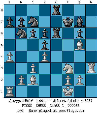 Last move : 1-0 2007 December 24 9:47:39 [Event "FICGS__CHESS__CLASS_C__000053"] [Site "FICGS"] [Date "2007.07.29"] [Round "1"] [White "Staggat,Rolf"] [Black "Wilson,Jaimie"] [Result "1-0"] [WhiteElo "1661"] [BlackElo "1676"] 1.e4 Nf6 2.e5 Nd5 3.d4 d6 4.Nf3 g6 5.Bc4 Nb6 6.Bb3 Bg7 7.Qe2 O-O 8.e6 d5 9.Ng5 Bxe6 10.Nxe6 fxe6 11.Qxe6+ Kh8 12.c3 Na6 13.h4 Qd6 14.Qxd6 exd6 15.h5 Rae8+ 16.Kf1 Kg8 17.Nd2 c6 18.Nf3 Nc7 19.hxg6 hxg6 20.Bc2 Rf6 21.a4 Kf7 22.Bg5 Rfe6 23.Rh3 1-0 This chess game has been lost on time (started : 2007.07.29 23:39:57) Alekhine's defense : Modern, Fianchetto variation Kingside Castling by player Black (move 7) Player White won this chess game. Follow this game move after move (download)A strong memory, concentration, imagination, and a strong will is required to become a great Chess player. (Bobby Fischer) Mein erstes Ziel war nicht, die Partie zu gewinnen, sondern eine Figur zu opfern. -- der junge (Wilhelm Steinitz) El juego del Ajedrez no es solamente una diversión quieta; algunas cualidades muy valuables de la mente se pueden adquirir y cultivar con el, como convertirlos en habitos disponibles para toda ocasión; ya que la vida es algo así como el Ajedrez. (Benjamin Franklin) Le thème de l'attaque double intervient d'une manière ou d'une autre dans l'immense majorité des combinaisons. (Youri Averbakh) The question of whether computers can think is just like question of whether submarines can swim. (Edsger W. Dijkstra)