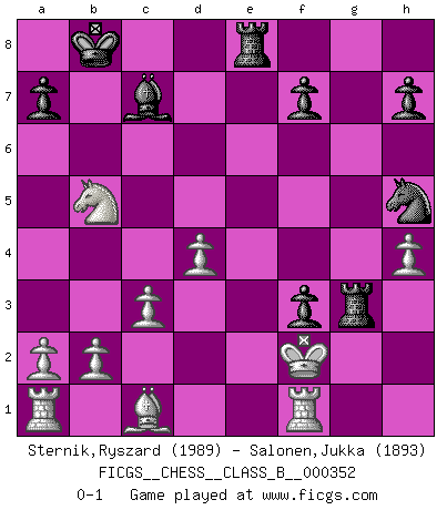 Last move : 0-1 2022 March 27 12:23:19 [Event "FICGS__CHESS__CLASS_B__000352"] [Site "FICGS"] [Date "2022.02.19"] [Round "1"] [White "Sternik,Ryszard"] [Black "Salonen,Jukka"] [Result "0-1"] [WhiteElo "1989"] [BlackElo "1893"] 1.e4 e5 2.f4 exf4 3.Nf3 g5 4.h4 g4 5.Ne5 Nf6 6.Bc4 d5 7.exd5 Bd6 8.d4 Nh5 9.Bb5+ c6 10.dxc6 bxc6 11.Nxc6 Nxc6 12.Bxc6+ Bd7 13.Bxd7+ Qxd7 14.O-O O-O-O 15.Qd3 Bc7 16.c3 Rde8 17.Qa6+ Kb8 18.Na3 f3 19.gxf3 gxf3 20.Qb5+ Qxb5 21.Nxb5 Rhg8+ 22.Kf2 Rg3 0-1 KGA : Kieseritsky, Berlin defense, 6.Bc4 Kingside Castling by player White (move 14) Queenside Castling by player Black (move 14) Player Black won this chess game. Follow this game move after move (download)When you play Bobby, it is not a question if you win or lose. It is a question if you survive. (Boris Spassky) Der Freibauer hat für mich eine Seele, genau wie der Mensch, Wünsche, die unerkannt in ihm schlummern, und Befürchtungen, von deren Existenz er selbst kaum ahnt. (Aaron Nimzowitsch) No puedes jugar al Ajedrez si eres de corazón noble. (Proverbio Francés) Psychologiquement, tu dois avoir confiance en toi même, mais cette confiance doit être basée sur des faits. (Robert Fischer) All battles are fought by scared men who'd rather be someplace else. (John Wayne in the movie In harm's way)