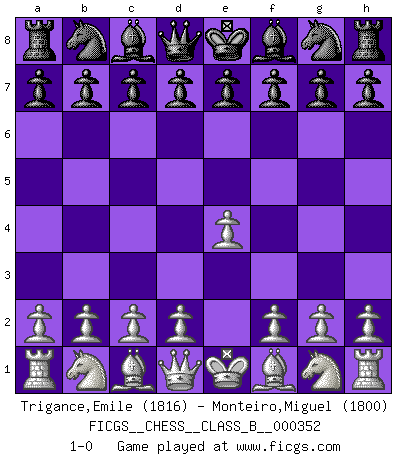 Last move : 1-0 2022 March 31 16:2:22 [Event "FICGS__CHESS__CLASS_B__000352"] [Site "FICGS"] [Date "2022.02.19"] [Round "1"] [White "Trigance,Emile"] [Black "Monteiro,Miguel"] [Result "1-0"] [WhiteElo "1816"] [BlackElo "1800"] 1.e4 1-0 This chess game has been lost on time (started : 2022.02.19 7:23:14) King's pawn Opening Player White won this chess game. Follow this game move after move (download)Chess is a cold bath for the mind. (Sir John Simon) Die unerbitterlichsten Regeln im Schach sind die Ausnahmen. (Savielly Grigorievitsch Tartakower) Cada Peón es potencialmente una Reina. (James Mason) Même si l'adversaire joue le coup analysé précédemment, recommencez l'analyse en voyant la nouvelle position. Première règle de Blumenfeld All maxims have their antagonist maxims; proverbs should be sold in pairs, a single one being but a half truth. (William Mathews)