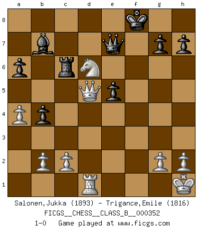 Last move : 1-0 2022 April 9 10:2:58 [Event "FICGS__CHESS__CLASS_B__000352"] [Site "FICGS"] [Date "2022.02.19"] [Round "1"] [White "Salonen,Jukka"] [Black "Trigance,Emile"] [Result "1-0"] [WhiteElo "1893"] [BlackElo "1816"] 1.e4 c5 2.Nf3 d6 3.d4 cxd4 4.Nxd4 Nf6 5.Nc3 a6 6.Bg5 e6 7.f4 b5 8.e5 dxe5 9.fxe5 Qc7 10.exf6 Qe5+ 11.Be2 Qxg5 12.O-O Qe5 13.Nf3 Bc5+ 14.Kh1 Qxf6 15.a4 b4 16.Ne4 Qe7 17.Ne5 O-O 18.Nxf7 Rxf7 19.Rxf7 Kxf7 20.Bh5+ Kg8 21.Nxc5 Ra7 22.Qd4 Nc6 23.Qe3 Qf6 24.Rd1 e5 25.Bf3 Rc7 26.Qb3+ Kf8 27.Bxc6 Rxc6 28.Ne4 Qe7 29.Qd5 Bb7 30.Nd6 1-0 Sicilian : Najdorf, Polugayevsky variation Kingside Castling by player White (move 12) Kingside Castling by player Black (move 17) Player White won this chess game. Follow this game move after move (download)No Chess Grandmaster is normal; they only differ in the extent of their madness. (Viktor Korchnoi) Mein erstes Ziel war nicht, die Partie zu gewinnen, sondern eine Figur zu opfern. -- der junge (Wilhelm Steinitz) Hasta este punto, las blancas han seguido un análisis bien conocido. Pero ahora el hace un error fatal: empieza a usar su propia cabeza. (Siegbert Tarrasch) La vérité est comme le meilleur coup aux échecs : elle existe, mais il faut la chercher. (Arturo Perez-Reverte) If you know the enemy and know yourself you need not fear the results of a hundred battles. (Sun Tzu)