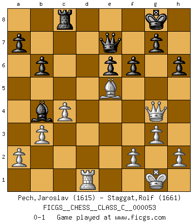 Last move : 0-1 2008 March 29 17:25:38 [Event "FICGS__CHESS__CLASS_C__000053"] [Site "FICGS"] [Date "2007.07.29"] [Round "1"] [White "Pech,Jaroslav"] [Black "Staggat,Rolf"] [Result "0-1"] [WhiteElo "1615"] [BlackElo "1661"] 1.d4 Nf6 2.c4 e6 3.Nf3 b6 4.g3 Ba6 5.b3 Bb4+ 6.Bd2 Be7 7.Bg2 c6 8.Bc3 d5 9.Nbd2 Nbd7 10.O-O O-O 11.Re1 c5 12.e4 dxe4 13.Nxe4 Bb7 14.Nfg5 Nxe4 15.Nxe4 cxd4 16.Bxd4 Qc7 17.Qh5 Rad8 18.Rad1 h6 19.Ba1 Bxe4 20.Bxe4 Nf6 21.Qf3 Nxe4 22.Qxe4 Bb4 23.Rf1 Qe7 24.Be5 Rxd1 25.Rxd1 Rc8 26.Qg4 f6 0-1 This chess game has been lost on time (started : 2007.07.29 23:39:57) Queen's Indian : Nimzovich variation (exaggerated Fianchetto) Kingside Castling by player White (move 10) Kingside Castling by player Black (move 10) Player Black won this chess game. Follow this game move after move (download)It's just you and your opponent at the board and you're trying to prove something. (Bobby Fischer) Ich war schon mal beim Dopingtest. Da musste ich Urin abgeben, während Dritte zusahen. (Elisabeth Pähtz) Fischer sacrificó virtualmente todo lo que la mayoría de nosotros los 'debiles' (término que él usa) valoramos, respetamos y apreciamos por el amor de un astuto, a menudo hermoso tablero de juego, por el privilegio ambivalente de ser su mas grande maestro. (Paul Kollar) Il s'avisa de me proposer d'apprendre les échecs qu'il jouait un peu... me voilà forcené des échecs. J'achète un échiquier, je m'enferme dans ma chambre, j'y passe des jours et des nuits à vouloir apprendre par cur toutes les parties. (Jean-Jacques Rousseau, Confessions) SEO proverb : Make your website optimized for human beings, not for search engines.