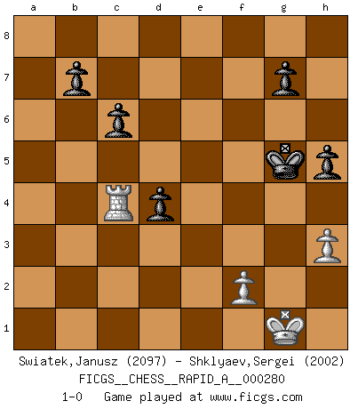 Last move : 1-0 2022 May 3 20:59:16 [Event "FICGS__CHESS__RAPID_A__000280"] [Site "FICGS"] [Date "2022.02.23"] [Round "1"] [White "Swiatek,Janusz"] [Black "Shklyaev,Sergei"] [Result "1-0"] [WhiteElo "2097"] [BlackElo "2002"] 1.e4 e5 2.Nf3 Nc6 3.Bb5 Nf6 4.O-O Nxe4 5.Re1 Nd6 6.Nxe5 Be7 7.Bf1 Nxe5 8.Rxe5 O-O 9.d4 Bf6 10.Re1 Nf5 11.c3 d5 12.a4 a5 13.Nd2 c6 14.Nf3 Nd6 15.h3 h6 16.Bf4 Bf5 17.Qb3 Be4 18.Nd2 Bg6 19.Nf3 Be4 20.Ne5 Re8 21.Re2 Bg5 22.Bh2 Ra6 23.Nd3 Rb6 24.Qa2 Rf8 25.Nc5 Bg6 26.Bxd6 Qxd6 27.Rae1 h5 28.Re8 Rxe8 29.Rxe8+ Kh7 30.b4 Bd8 31.Re1 axb4 32.a5 bxc3 33.axb6 Bxb6 34.Bd3 Bxc5 35.dxc5 Qxc5 36.Bxg6+ fxg6 37.g4 c2 38.Rc1 d4 39.Qxc2 Qg5 40.Qc5 Kh6 41.Qxg5+ Kxg5 42.gxh5 gxh5 43.Rc4 1-0 Ruy Lopez : Berlin defense, Open variation Kingside Castling by player White (move 4) Kingside Castling by player Black (move 8) 10 pieces endgame at move 42 : White KRPP , Black KPPPPP WHITE : King + 1 Rook 2 Pawns BLACK : King + 5 Pawns Player White won this chess game. Follow this game move after move (download)The tactician knows what to do when there is something to do; whereas the strategian knows what to do when there is nothing to do. (Gerald Abrahams) Im Reiche der Wirklichkeit ist man nie so glücklich wie im Reiche der Gedanken. (Arthur Schopenhauer) Todo lo que importa ante el tablero de Ajedrez son buenas jugadas. (Bobby Fischer) Votre seul travail dans les ouvertures est d'obtenir un milieu de partie jouable. (Lajos Portish) The absolute truth is the thing that makes people laugh. (Carl Reiner)