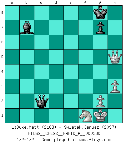 Last move : 1/2-1/2 2022 May 25 4:39:35 [Event "FICGS__CHESS__RAPID_A__000280"] [Site "FICGS"] [Date "2022.02.23"] [Round "1"] [White "LaDuke,Matt"] [Black "Swiatek,Janusz"] [Result "1/2-1/2"] [WhiteElo "2163"] [BlackElo "2097"] 1.e4 e6 2.d4 d5 3.Nc3 Nf6 4.e5 Nfd7 5.f4 c5 6.Nf3 Nc6 7.Be3 a6 8.Qd2 b5 9.a3 Nxd4 10.Nxd4 cxd4 11.Bxd4 Bc5 12.Bxc5 Nxc5 13.b4 Nd7 14.Bd3 Bb7 15.O-O Qb6+ 16.Kh1 O-O 17.a4 bxa4 18.Nxa4 Qc7 19.Nc3 f6 20.exf6 Rxf6 21.Ne2 e5 22.fxe5 Rxf1+ 23.Rxf1 Nxe5 24.Qf4 Qe7 25.Bf5 Ng6 26.Qd2 Rf8 27.Kg1 Re8 28.Bxg6 hxg6 29.Nd4 Bc8 30.c3 g5 31.Nc2 Qd8 32.Re1 Rxe1+ 33.Qxe1 Qc7 34.Qe8+ Kh7 35.Qh5+ Kg8 36.Qxg5 Qxc3 37.Qxd5+ Kf8 38.Qd8+ Kf7 39.Qd1 a5 40.bxa5 Qxa5 41.Qf3+ Kg8 42.Qd3 Qc5+ 43.Ne3 Qc1+ 44.Nf1 Qc7 45.Qe3 Bb7 46.h3 Qc2 47.Qe8+ Kh7 48.Qh5+ Kg8 1/2-1/2 French : Steinitz, Boleslavsky variation Kingside Castling by player White (move 15) Kingside Castling by player Black (move 16) 10 pieces endgame at move 40 : White KQNPPP , Black KQBP WHITE : King + 1 Queen 1 Knight 3 Pawns BLACK : King + 1 Queen 1 Bishop 1 Pawn 9 pieces endgame at move 40 : White KQNPP , Black KQBP WHITE : King + 1 Queen 1 Knight 2 Pawns BLACK : King + 1 Queen 1 Bishop 1 Pawn This chess game ended in a draw. Follow this game move after move (download)Chess is the gymnasium of the mind. (Blaise Pascal) Gott hat gewollt, dass ich Champion werde. (Surab Azmajparaschvili) Aquellos que dicen que entienden al Ajedrez, no entienden nada. (Robert Hubner) Il s'avisa de me proposer d'apprendre les échecs qu'il jouait un peu... me voilà forcené des échecs. J'achète un échiquier, je m'enferme dans ma chambre, j'y passe des jours et des nuits à vouloir apprendre par cur toutes les parties. (Jean-Jacques Rousseau, Confessions) Who needs drugs and alcohol if he can play Big Chess at FICGS ? (Heinz-Georg Lehnhoff)