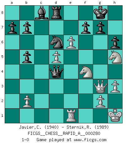 Last move : 1-0 2022 June 25 14:7:57 [Event "FICGS__CHESS__RAPID_A__000280"] [Site "FICGS"] [Date "2022.02.23"] [Round "1"] [White "Javier,Christian"] [Black "Sternik,Ryszard"] [Result "1-0"] [WhiteElo "1940"] [BlackElo "1989"] 1.d4 Nf6 2.c4 e6 3.Nc3 d5 4.cxd5 exd5 5.Bg5 Be7 6.e3 O-O 7.Bd3 h6 8.Bh4 c6 9.Nge2 Nbd7 10.Qc2 Ne8 11.Bg3 Bd6 12.f3 Bxg3+ 13.Nxg3 Ndf6 14.O-O Be6 15.Nce2 Nd6 16.e4 dxe4 17.fxe4 Nb5 18.Bxb5 cxb5 19.h3 Rc8 20.Qd2 Bc4 21.Rae1 Bxa2 22.Rf3 Be6 23.Nf4 Qb6 24.Kh1 Rc4 25.d5 Rd4 26.Rd3 Rxd3 27.Qxd3 Rd8 28.Qf3 Bc8 29.e5 Ne8 30.e6 Nd6 31.Ngh5 Qd4 32.Qg3 1-0 This chess game has been lost on time (started : 2022.02.23 21:40:22) Queen's pawn game Kingside Castling by player Black (move 6) Kingside Castling by player White (move 14) Player White won this chess game. Follow this game move after move (download)Some part of a mistake is always correct. (Savielly Tartakover) Die Auseinandersetzung mit Karpow war politisch geprägt. Er stand für das kommunistische System, wurde von dessen Repräsentanten gehätschelt. Ich war der Oppositionelle. Jeder Schachweltmeister spiegelt auch die gesellschaftlichen Verhältnisse wider. Kramnik steht für die Börsen-Generation des Neuen Markts, ideologiefrei, zahlenfixiert. (Garry Kasparov) No puedes jugar al Ajedrez si eres de corazón noble. (Proverbio Francés) Les Echecs sont affaire de jugement sensible. Savoir quand frapper et quand esquiver. (Fischer) My poor ole parrot... Is not in the circulation of displays ....poo hoo hoo :) (Wayne Lowrance's enigma)