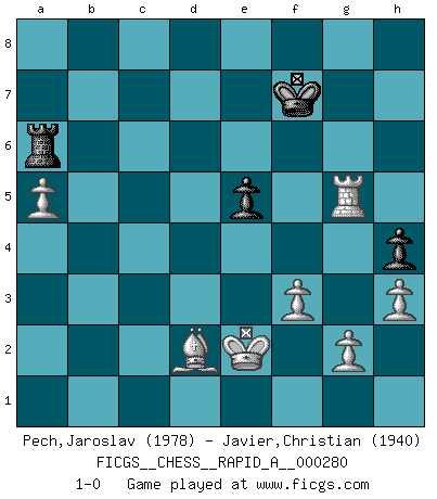 Last move : 1-0 2022 July 9 11:53:55 [Event "FICGS__CHESS__RAPID_A__000280"] [Site "FICGS"] [Date "2022.02.23"] [Round "1"] [White "Pech,Jaroslav"] [Black "Javier,Christian"] [Result "1-0"] [WhiteElo "1978"] [BlackElo "1940"] 1.e4 c5 2.Nf3 Nc6 3.d4 cxd4 4.Nxd4 e6 5.Nc3 Nf6 6.Nxc6 bxc6 7.e5 Nd5 8.Ne4 Bb7 9.Be2 c5 10.O-O Be7 11.Bf3 Rb8 12.c4 Nb4 13.b3 a5 14.Bb2 O-O 15.Bc3 Nc6 16.Nd6 a4 17.Nxb7 Rxb7 18.bxa4 Ra7 19.Rb1 Nd4 20.a5 Nxf3+ 21.Qxf3 Qa8 22.Qxa8 Rfxa8 23.Rb5 f6 24.Rd1 fxe5 25.f3 Kf7 26.a3 h5 27.h3 d6 28.a4 h4 29.Rb6 Kg6 30.Be1 Kf5 31.Kf1 g5 32.Rc6 d5 33.cxd5 Ra6 34.Rb6 c4 35.dxe6 Bc5 36.e7 R6a7 37.Rc6 Bxe7 38.Rd5 Ra6 39.Rb6 R6a7 40.Bc3 Bf6 41.Rc5 Rd7 42.Rxc4 Bd8 43.Rb5 Bf6 44.Rc6 Bg7 45.a6 Bh8 46.Ke2 Kf4 47.Rb7 Ra7 48.Rxd7 Rxd7 49.Bd2+ Kf5 50.Rc8 Ra7 51.Rxh8 Rxa6 52.a5 Kg6 53.Rg8+ Kf7 54.Rxg5 1-0 Sicilian defense Kingside Castling by player White (move 10) Kingside Castling by player Black (move 14) Player White won this chess game. Follow this game move after move (download)During a Chess competition a Chessmaster should be a combination of a beast of prey and a monk. (Alexander Alekhine) Offensichtlich kennt Kasparow nichts anderes als Schach, und ich könnte 500 weitere Spieler dieser Sorte benennen. (Judith Polgar) Con o sin el título, Bobby Fischer fue sin lugar a dudas el mas grande jugador de su época. (Burt Hochberg) Ce qui caractérise les parties de combat, c'est que si le défenseur a constamment de difficiles problèmes à résoudre, l'attaquant doit chercher sans relâche de nouvelles possibilités d'attaque. (Koblentz) Employ the attack like tactic of defense. (Chinese proverb)