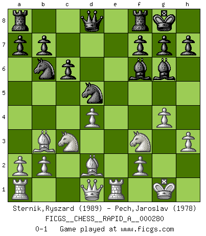 Last move : 0-1 2022 June 4 12:19:27 [Event "FICGS__CHESS__RAPID_A__000280"] [Site "FICGS"] [Date "2022.02.23"] [Round "1"] [White "Sternik,Ryszard"] [Black "Pech,Jaroslav"] [Result "0-1"] [WhiteElo "1989"] [BlackElo "1978"] 1.e4 e6 2.d4 d5 3.exd5 exd5 4.c4 Nf6 5.Nc3 Be7 6.Nf3 O-O 7.Bd3 dxc4 8.Bxc4 Bg4 9.Be3 Nbd7 10.h3 Bh5 11.O-O Nb6 12.Bb3 Nfd5 13.Bd2 Bf6 14.Re1 c6 15.g4 Bg6 0-1 This chess game has been lost on time (started : 2022.02.23 21:40:22) French : Exchange variation Kingside Castling by player Black (move 6) Kingside Castling by player White (move 11) Player Black won this chess game. Follow this game move after move (download)Later, I began to succeed in decisive games. Perhaps because I realized a very simple truth: not only was I worried, but also my opponent. (Mikhail Tal) Im Spitzenschach von heute geht es nur um Vorbereitung, um tiefgründige, sorgfältige Eröffnungsvorbereitung. (Nigel Short) No hay precio que no valga la pena por la cabellera del Rey enemigo. (Koblentz) Un millionnaire : 'Monsieur Steinitz ! Vous ne participez aux tournois que pour l'argent, alors que moi je n'y viens que pour l'honneur.' Steinitz : 'Chacun joue pour ce qu'il n'a pas'... A good programmer is someone who always looks both ways before crossing a one-way street. (Doug Linder)