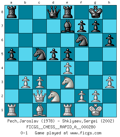 Last move : 0-1 2022 May 13 18:55:26 [Event "FICGS__CHESS__RAPID_A__000280"] [Site "FICGS"] [Date "2022.02.23"] [Round "1"] [White "Pech,Jaroslav"] [Black "Shklyaev,Sergei"] [Result "0-1"] [WhiteElo "1978"] [BlackElo "2002"] 1.e4 e5 2.Nf3 Nc6 3.Bb5 a6 4.Ba4 Nf6 5.O-O Be7 6.Re1 b5 7.Bb3 d6 8.c3 O-O 9.h3 h6 10.d4 Re8 11.Nbd2 Bd7 12.Nf1 a5 13.d5 Nb8 14.a4 bxa4 15.Bxa4 c6 16.dxc6 Bxc6 17.Bxc6 Nxc6 18.Ne3 Nb8 19.Nd2 Nbd7 20.b3 Nc5 21.Qc2 d5 0-1 This chess game has been lost on time (started : 2022.02.23 21:40:22) Ruy Lopez : Closed Kingside Castling by player White (move 5) Kingside Castling by player Black (move 8) Player Black won this chess game. Follow this game move after move (download)A great player and a great example for many. His book My 60 Memorable Games had a big impact on me. It is a shame he didn't continue to enrich the world of chess with his unparalleled understanding after 1972. (Jan Timman, about Bobby Fischer's death) Wie, soll nun auch die Opposition abgeschafft werden? Ja, es tut mir leid, Ihnen diesen Schmerz nicht ersparen zu können. (Aaron Nimzowitsch) Me siento como si fuera una pieza en una partida de Ajedrez, cuando mi oponente me indica: esa pieza no puede ser movida. (Soren Kierkegaard) J'ai vu le vaincu d'Echecs jouer des années durant dans l'espoir de la fête de la victoire. Car tu es plus riche de ce qu'elle existe si même elle n'est point pour toi. Ainsi de la perle du fond des mers. (Antoine de Saint-Exupéry) Mandala - that's it! 16x16 squares as multiple of the four and the eight because of the Four Noble Truths and the Noble Eightfold Path. (Heinz-Georg Lehnhoff about Big Chess)