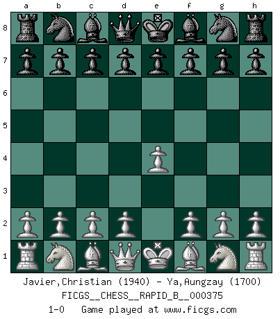 Last move : 1-0 2022 March 30 14:35:3 [Event "FICGS__CHESS__RAPID_B__000375"] [Site "FICGS"] [Date "2022.02.27"] [Round "1"] [White "Javier,Christian"] [Black "Ya,Aungzay"] [Result "1-0"] [WhiteElo "1940"] [BlackElo "1700"] 1.e4 1-0 This chess game has been lost on time (started : 2022.02.27 14:33:38) King's pawn Opening Player White won this chess game. Follow this game move after move (download)You can only get good at Chess if you love the game. (Bobby Fischer) Schach ist ein Reich, wo sich die menschliche Phantasie frei entfalten kann. (David Bronstein) El Ajedrez, como la música, como el amor, tiene el poder de hacer feliz a la gente. (Siegbert Tarrasch) Les échecs sont un jeu terrible. Si vous n'avez pas le centre, votre adversaire a une position plus libre. Par contre, si vous avez le centre, alors vous avez vraiment quelque chose pour laquelle vous inquiéter ! (Siegbert Tarrasch) The age of a woman doesn't mean a thing. The best tunes are played on the oldest fiddles. (Ralph Waldo Emerson)