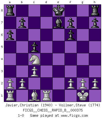 Last move : 1-0 2022 May 15 11:58:51 [Event "FICGS__CHESS__RAPID_B__000375"] [Site "FICGS"] [Date "2022.02.27"] [Round "1"] [White "Javier,Christian"] [Black "Vollmer,Steve"] [Result "1-0"] [WhiteElo "1940"] [BlackElo "1774"] 1.e4 c5 2.Nf3 Nc6 3.Bb5 d6 4.O-O e5 5.c3 Nf6 6.d4 Bd7 7.dxc5 dxc5 8.Nbd2 a6 9.Bxc6 Bxc6 10.Nxe5 Bxe4 11.Re1 Qd5 12.Nec4 Be7 13.Nxe4 Qxd1 14.Nxf6+ gxf6 15.Rxd1 1-0 Sicilian : Nimzovich-Rossolimo attack (without ...d6) Kingside Castling by player White (move 4) Player White won this chess game. Follow this game move after move (download)Bobby Fischer's current state of mind is indeed a tragedy. One of the world's greatest Chess players - the pride and sorrow of American Chess. (Frank Brady) Woher wissen wir, daß der Neanderthaler Blindschach gespielt hat? -- Bei Ausgrabungen wurden keine Schachbretter und Figuren gefunden. (Anonymous) Una buena ofensiva y una buena defensa, comienzan ambas con un buen desarrollo. (Bruce A. Moon) Les ravages du H expliquent la différence de niveau entre Tal et Thal [Abergel]. That's absurd. I love it. (Gregory House, House M.D.)