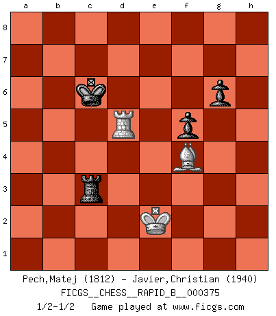 Last move : 1/2-1/2 2022 November 11 16:36:39 [Event "FICGS__CHESS__RAPID_B__000375"] [Site "FICGS"] [Date "2022.02.27"] [Round "1"] [White "Pech,Matej"] [Black "Javier,Christian"] [Result "1/2-1/2"] [WhiteElo "1812"] [BlackElo "1940"] 1.e4 e5 2.Nf3 Nc6 3.Bb5 Nf6 4.O-O Nxe4 5.d4 Nd6 6.Bxc6 dxc6 7.dxe5 Nf5 8.Qxd8+ Kxd8 9.Nc3 Be7 10.h3 Nh4 11.Nxh4 Bxh4 12.Be3 h5 13.Rad1+ Ke8 14.Ne2 Be7 15.f4 f5 16.Rd2 Kf7 17.Rfd1 Be6 18.a4 c5 19.a5 c6 20.b3 b6 21.Kf2 Rhb8 22.Ra1 h4 23.Ng1 c4 24.bxc4 Bxc4 25.Rd7 Ke8 26.R7d1 Bd5 27.Nf3 bxa5 28.Rxa5 Rb2 29.Nd4 Be4 30.Rda1 c5 31.Bc1 Rb6 32.Nf3 Bxc2 33.Rxa7 Rxa7 34.Rxa7 Be4 35.Ba3 Rb7 36.Ra5 Bd8 37.Ra4 Be7 38.Ra8+ Kd7 39.Ra6 Bd3 40.Ra5 Bd8 41.Ra8 Be7 42.Ra5 Kc6 43.Ke3 Bc4 44.Kf2 Kb6 45.Ra8 Bd5 46.Ke2 Rc7 47.Rb8+ Kc6 48.Ra8 Kb5 49.Rb8+ Kc6 50.Ra8 Bc4+ 51.Ke3 Rb7 52.Kf2 g6 53.Bc1 Bd5 54.Ra6+ Kc7 55.Ra5 Bc6 56.Be3 Rb2+ 57.Kf1 Kb6 58.Ra1 Rb3 59.Ke2 Rb2+ 60.Kf1 Rb3 61.Ke2 Rb4 62.Kd3 Kb7 63.Kc2 Bd5 64.Ra3 Re4 65.Nd2 Rb4 66.Nf3 Kb6 67.Ra1 Bb7 68.Kc3 Kb5 69.Ra7 Kb6 70.Ra1 Bd5 71.Kc2 Bc6 72.Kd3 Ba4 73.Kd2 Bb5 74.Kc2 Rc4+ 75.Kd2 Rb4 76.Kc2 Ba4+ 77.Kd2 Rb2+ 78.Ke1 Bb5 79.Nd2 Ba6 80.Kd1 Rb4 81.Kc2 Bb7 82.Nf3 Bd5 83.Ra3 Be4+ 84.Kc3 Bd8 85.Rb3 Kb5 86.Bf2 Bd5 87.Rb2 Ka4 88.Rd2 Rc4+ 89.Kd3 Ba5 90.Ra2+ Kb5 91.Rb2+ Rb4 92.Kc2 Ka4 93.Kc1 Rxf4 94.Bxc5 Bxf3 95.gxf3 Rxf3 96.e6 Bd8 97.Rb4+ Ka5 98.e7 Bxe7 99.Bxe7 Rxh3 100.Rxh4 Re3 101.Bf6 Kb5 102.Kd2 Ra3 103.Ke2 Rg3 104.Rd4 Rg1 105.Be7 Rc1 106.Bg5 Rc2+ 107.Ke3 Rc3+ 108.Ke2 Rg3 109.Bf4 Rc3 110.Rd5+ Kc6 1/2-1/2 Ruy Lopez : Berlin defense, Open variation Kingside Castling by player White (move 4) 10 pieces endgame at move 98 : White KRBP , Black KRBPPP WHITE : King + 1 Rook 1 Bishop 1 Pawn BLACK : King + 1 Rook 1 Bishop 3 Pawns 9 pieces endgame at move 99 : White KRBP , Black KRPPP WHITE : King + 1 Rook 1 Bishop 1 Pawn BLACK : King + 1 Rook 3 Pawns 8 pieces endgame at move 99 : White KRB , Black KRPPP WHITE : King + 1 Rook 1 Bishop BLACK : King + 1 Rook 3 Pawns 7 pieces endgame at move 100 : White KRB , Black KRPP WHITE : King + 1 Rook 1 Bishop BLACK : King + 1 Rook 2 Pawns This chess game ended in a draw. Follow this game move after move (download)The blunders are all there on the board, waiting to be made. (Savielly Tartakover) Es hat in meinem Leben Zeiten gegeben, in denen das Schachspiel, wenn nicht zum Lebenszweck, so doch zu einem regelrechten Lebensersatz geworden ist. Man fühlt sich in solchen Zeiten nicht so, als besäße man eine göttliche Gabe, sondern eher so, als sei man von ihr besessen. (Garry Kasparov) El tablero es el mundo, las piezas es el fenomeno del universo, las reglas del juego son lo que llamamos leyes de la naturaleza y el jugador del lado opuesto, se encuentra oculto a nuestra vista. (Thomas Huxley) Tout change constamment, y compris dans le monde des Echecs. (Botvinnik) Perhaps the current trend of many chess professionals taking up the more lucrative pastime of poker is not a wholly negative one. It may not be too late for humans to relearn how to take risks in order to innovate and thereby maintain the advanced lifestyles we enjoy. And if it takes a poker-playing supercomputer to remind us that we can't enjoy the rewards without taking the risks, so be it. (The Chess Master and the Computer, by Garry Kasparov - 2010)