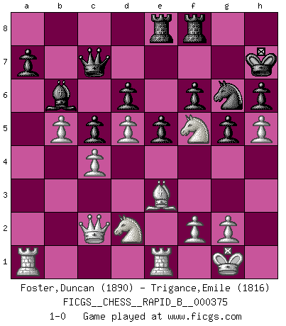 Last move : 1-0 2022 May 25 11:16:52 [Event "FICGS__CHESS__RAPID_B__000375"] [Site "FICGS"] [Date "2022.02.27"] [Round "1"] [White "Foster,Duncan"] [Black "Trigance,Emile"] [Result "1-0"] [WhiteElo "1890"] [BlackElo "1816"] 1.e4 c5 2.a3 Nc6 3.b4 e5 4.b5 Nd4 5.c3 Ne6 6.Bc4 Nf6 7.d3 h6 8.Nf3 d6 9.O-O Be7 10.Re1 g5 11.h3 Ng7 12.Be3 Be6 13.Nbd2 Qd7 14.a4 O-O 15.Bxe6 Nxe6 16.Nf1 Nf4 17.Ng3 Kh7 18.d4 Qe6 19.d5 Qd7 20.Qc2 Rae8 21.Nf5 Bd8 22.Nd2 b6 23.a5 N6xd5 24.exd5 Ng6 25.axb6 Bxb6 26.c4 Qc7 27.h4 f6 28.h5 1-0 Sicilian defense Kingside Castling by player White (move 9) Kingside Castling by player Black (move 14) Player White won this chess game. Follow this game move after move (download)I know people who have all the will in the world, but still can't play good Chess. (Bobby Fischer) Ich war zu klein für die Schach-Schülermannschaft! (Woody Allen) Bendita sea la memoria de aquel que dio al mundo este juego inmortal. (A. G. Gardiner) Vous savez, camarade Pachman, je n'éprouve pas de plaisir à être ministre, je jouerais plutôt aux échecs comme vous, ou alors ferais une révolution au Venezuela. (Che Guevara à Ludek Pachman, 'Checkmate in Prague', 1975) Beep ! (R2D2 in Star Wars ep.3)