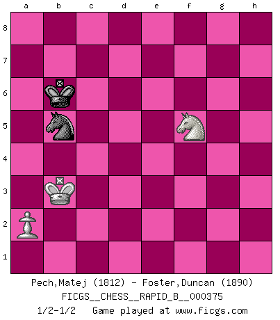 Last move : 1/2-1/2 2022 September 2 17:58:58 [Event "FICGS__CHESS__RAPID_B__000375"] [Site "FICGS"] [Date "2022.02.27"] [Round "1"] [White "Pech,Matej"] [Black "Foster,Duncan"] [Result "1/2-1/2"] [WhiteElo "1812"] [BlackElo "1890"] 1.d4 f5 2.Nf3 d6 3.c4 Nf6 4.Nc3 g6 5.e3 Bg7 6.Be2 O-O 7.O-O c6 8.b4 Qe8 9.Bb2 h6 10.d5 Qf7 11.Rc1 a5 12.b5 c5 13.Na4 Nbd7 14.Nh4 b6 15.Bd3 Rb8 16.Qe2 Nh5 17.f4 Bxb2 18.Qxb2 Ndf6 19.Nc3 e5 20.dxe6 Bxe6 21.e4 Bxc4 22.Bxc4 Qxc4 23.Nxg6 Qd4+ 24.Qf2 Qxf2+ 25.Rxf2 Rf7 26.e5 Kh7 27.Nh4 Ng4 28.e6 Re7 29.Nxf5 Rxe6 30.Rf3 Rbe8 31.Rd1 Re1+ 32.Rxe1 Rxe1+ 33.Rf1 Rxf1+ 34.Kxf1 Nxf4 35.g3 Kg6 36.Nh4+ Kh5 37.gxf4 Kxh4 38.Nd5 Nxh2+ 39.Kg2 Ng4 40.Nxb6 Nf6 41.Kf3 d5 42.Na4 Nd7 43.b6 c4 44.b7 Nb8 45.Ke3 Kg4 46.Nc3 d4+ 47.Kxd4 Kxf4 48.Nd5+ Kf3 49.Nf6 Kf4 50.Kxc4 Ke5 51.Ng4+ Kd6 52.Nxh6 Kc7 53.Kb5 Kxb7 54.Kxa5 Nc6+ 55.Kb5 Na7+ 56.Kb4 Kb6 57.Nf5 Nc6+ 58.Kc3 Na7 59.Kb3 Nb5 1/2-1/2 Dutch Kingside Castling by player Black (move 6) Kingside Castling by player White (move 7) 10 pieces endgame at move 47 : White KNPPP , Black KNPPP WHITE : King + 1 Knight 3 Pawns BLACK : King + 1 Knight 3 Pawns 9 pieces endgame at move 47 : White KNPP , Black KNPPP WHITE : King + 1 Knight 2 Pawns BLACK : King + 1 Knight 3 Pawns 8 pieces endgame at move 50 : White KNPP , Black KNPP WHITE : King + 1 Knight 2 Pawns BLACK : King + 1 Knight 2 Pawns 7 pieces endgame at move 52 : White KNPP , Black KNP WHITE : King + 1 Knight 2 Pawns BLACK : King + 1 Knight 1 Pawn 6 pieces endgame at move 53 : White KNP , Black KNP WHITE : King + 1 Knight 1 Pawn BLACK : King + 1 Knight 1 Pawn 5 pieces endgame at move 54 : White KNP , Black KN WHITE : King + 1 Knight 1 Pawn BLACK : King + 1 Knight This chess game ended in a draw. Follow this game move after move (download)Without error there can be no brilliancy. (Emanuel Lasker) Wenn es im Universum noch irgendwo intelligente Lebewesen gibt, dann kennen sie Go. (Emanuel Lasker) Los problemas de Ajedrez exigen del compositor las mismas virtudes que caracterizan todo el arte de valor: originalidad, invención, concisión, armonía, complejidad e insinceridad explendida. (Vladimir Nabokov) Mais l'homme est une créature légère et illogique : semblable au joueur d'échecs, il n'aime que le processus du but à atteindre, non le but lui-même. (Dostoïevsky) Men never do evil so completely and cheerfully as when they do it from religious conviction. (Blaise Pascal)