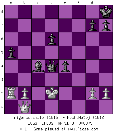 Last move : 0-1 2022 June 20 12:39:7 [Event "FICGS__CHESS__RAPID_B__000375"] [Site "FICGS"] [Date "2022.02.27"] [Round "1"] [White "Trigance,Emile"] [Black "Pech,Matej"] [Result "0-1"] [WhiteElo "1816"] [BlackElo "1812"] 1.e4 c5 2.Nf3 Nc6 3.d4 cxd4 4.Nxd4 Nf6 5.Nc3 e5 6.Ndb5 d6 7.Bg5 a6 8.Na3 b5 9.Nd5 Be7 10.Bxf6 Bxf6 11.c3 O-O 12.Nc2 Bg5 13.a4 bxa4 14.Rxa4 a5 15.Bc4 Rb8 16.Ra2 Kh8 17.Nce3 Bxe3 18.Nxe3 Ne7 19.O-O f5 20.exf5 Nxf5 21.Bd3 Nxe3 22.fxe3 Rxf1+ 23.Qxf1 Be6 24.c4 Rb4 25.Qa1 Qb6 26.Kf2 Rb3 27.Qb1 e4 28.Be2 Rxe3 29.Kf1 Rxe2 30.Kxe2 Bxc4+ 31.Kd2 Qd4+ 0-1 Sicilian : Pelikan (Lasker/Sveshnikov) variation Kingside Castling by player Black (move 11) Kingside Castling by player White (move 19) Player Black won this chess game. Follow this game move after move (download)In Chess, as it is played by masters, chance is practically eliminated. (Emanuel Lasker) In Buenos Aires ist es nicht mein vorrangiges Ziel ein starkes Turnier zu organisieren, sondern ein Turnier für Gentlemen. Ich würde nie Kamsky einladen. Ich mag keine Probleme. (Miguel Najdorf) ¡Examina movidas que hagan daño! Un buen ojo for movidas desvastantes es mucho mas importante que el conocimiento de principios estratégicos. (Purdy) Aux échecs, l'amour-propre est satisfait quand on remporte la victoire, mais il n'y a pas de honte à être battu. (Benjamin Franklin) Animated gif is worth one mega-word. (Unknown)