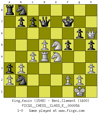 Last move : 1-0 2007 August 21 23:38:32 [Event "FICGS__CHESS__CLASS_E__000056"] [Site "FICGS"] [Date "2007.07.30"] [Round "1"] [White "King,Kevin"] [Black "Beni,Clement"] [Result "1-0"] [WhiteElo "1548"] [BlackElo "1600"] 1.e4 d6 2.d4 Nf6 3.Nc3 Nc6 4.h3 e6 5.Be3 g6 6.Nf3 h5 7.Bb5 Bd7 8.Qd2 Bg7 9.Ba4 a5 10.Bb3 O-O 11.O-O Qe7 12.Bh6 Ne8 13.Bxg7 Kxg7 14.Rfe1 f6 15.Rad1 Nb8 16.e5 a4 17.exd6 Nxd6 18.Bxe6 Bxe6 19.d5 Nc4 20.Qc1 a3 21.b3 Nb2 22.Rxe6 Qc5 23.Ne4 Qb4 24.Rd4 Qb5 25.Re7+ Rf7 26.Rxf7+ Kxf7 27.c4 Qd7 28.Qh6 f5 29.Ne5+ 1-0 Pirc defense Kingside Castling by player Black (move 10) Kingside Castling by player White (move 11) Player White won this chess game. Follow this game move after move (download)Nothing excites jaded Grandmasters more than a theoretical novelty. (Dominic Lawson) Auf Remis zu spielen ist gewissermaßen ein Verbrechen gegen das Schachspiel. (Mikhail Nekhemyevich Tal) Solo puedes ser bueno en el Ajedrez si amas al juego. (Bobby Fischer) Assurément je connaissais par expérience le mystérieux attrait de ce jeu royal, le seul entre tous les jeux inventés par les hommes qui échappe souverainement à la tyrannie du hasard, le seul où l'on ne doive sa victoire qu'à son intelligence ou plutôt à une certaine forme d'intelligence. Mais n'est-ce pas déjà le limiter injurieusement que d'appeler les échecs un jeu ? N'est-ce pas une science, un art ou quelque chose qui, comme le cercueil de Mahomet entre ciel et terre, est suspendu entre l'un et l'autre, et qui réunit un nombre incroyable de contraires ? [...] C'est une pensée qui ne mène à rien, une mathématique qui n'établit rien, un art qui ne laisse pas d'uvre, une architecture sans matière; et il l'a prouvé néanmoins qu'il était plus durable, à sa manière, que les livres ou que tout autre monument, ce jeu unique qui appartient à tous les peuples et à tous les temps, et dont personne ne sait quel dieu en fit don à la terre pour tuer l'ennui, pour aiguiser l'esprit et stimuler l'âme. Où commence-t-il, où finit-il ? (Stefan Zweig) I find your interest interesting. (Gregory House, House M.D.)