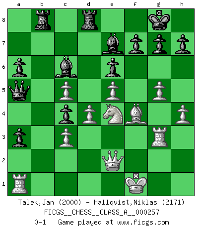 Last move : 0-1 2022 June 3 22:21:47 [Event "FICGS__CHESS__CLASS_A__000257"] [Site "FICGS"] [Date "2022.03.01"] [Round "1"] [White "Talek,Jan"] [Black "Hallqvist,Niklas"] [Result "0-1"] [WhiteElo "2000"] [BlackElo "2171"] 1.h3 Nf6 2.d4 d5 3.Bf4 c5 4.e3 Qb6 5.Nc3 a6 6.Na4 Qa5+ 7.c3 c4 8.b4 Qd8 9.g4 e6 10.Bg2 Be7 11.g5 Ne4 12.Bxe4 dxe4 13.Nc5 Qd5 14.f3 exf3 15.Nxf3 O-O 16.e4 Qd8 17.e5 b5 18.a4 bxa4 19.Nd2 Nd7 20.Rg1 Nxc5 21.bxc5 Bd7 22.Qf3 Rc8 23.Ne4 Bc6 24.h4 Qa5 25.Rg3 Rfd8 26.Kf1 a3 27.Qe2 Rb8 0-1 Clemenz (Mead's, Basman's or de Klerk's) Opening Kingside Castling by player Black (move 15) Player Black won this chess game. Follow this game move after move (download)Play the opening like a book, the middle game like a magician, and the endgame like a machine. (Spielmann) Moralische Siege zählen nicht. (Savielly Grigorievitsch Tartakower) Solo el jugador con la iniciativa tiene el derecho a atacar. (Wilhelm Steinitz) Les ravages du H expliquent la différence de niveau entre Tal et Thal [Abergel]. All art requires courage. (Anne Tucker)
