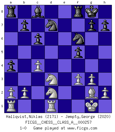 Last move : 1-0 2022 May 13 18:55:26 [Event "FICGS__CHESS__CLASS_A__000257"] [Site "FICGS"] [Date "2022.03.01"] [Round "1"] [White "Hallqvist,Niklas"] [Black "Jempty,George"] [Result "1-0"] [WhiteElo "2171"] [BlackElo "2020"] 1.c4 e5 2.g3 c6 3.Nf3 e4 4.Nd4 d5 5.d3 Bc5 6.Nb3 Bb4+ 7.Bd2 Bxd2+ 8.Qxd2 dxc4 9.dxc4 f5 10.Bg2 Nf6 11.f3 exf3 12.exf3 O-O 13.O-O Qxd2 14.N1xd2 a5 15.Nc5 a4 16.Rfd1 Nbd7 17.Nd3 1-0 English Opening Kingside Castling by player Black (move 12) Kingside Castling by player White (move 13) Player White won this chess game. Follow this game move after move (download)In Fischer's hands, a slight theoretical advantage is as good a being a Queen ahead. (Isaac Kashdan) Ich kenne keine einzige Person, die behaupten würde, Garri Kasparow sei ein guter Mensch (Nigel Short) Al jugar al Ajedrez entonces, podemos aprender: Primero: Previsión... Segundo: Prudencia... Tercero: Cautela... Y al final, aprendemos del Ajedrez el hábito de no ser desanimados por apariencias malas presentes en el estado de nuestros asuntos, el hábito de la esperanza por una oportunidad favorable y la perseveración de los secretos de los recursos. (Benjamin Franklin) Ce qui est bien, c'est d'avoir tout un tas de pièces en prise : l'adversaire ne peut en prendre qu'une à la fois. Cité par Thierry Audin. I don't diet. I just don't eat as much as I'd like to. (Linda Evangelista, supermodel)