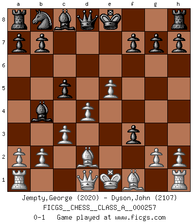 Last move : 0-1 2022 April 23 21:32:45 [Event "FICGS__CHESS__CLASS_A__000257"] [Site "FICGS"] [Date "2022.03.01"] [Round "1"] [White "Jempty,George"] [Black "Dyson,John"] [Result "0-1"] [WhiteElo "2020"] [BlackElo "2107"] 1.e4 e5 2.Nc3 Nf6 3.f4 d5 4.fxe5 Nxe4 5.Nf3 Bc5 6.d4 Bb4 7.Bd2 c5 8.Nxe4 dxe4 9.c3 exf3 0-1 This chess game has been lost on time (started : 2022.03.01 4:22:34) Vienna gambit Player Black won this chess game. Follow this game move after move (download)Robert Fischer is a law unto himself. (Larry Evans) Immer nach dem besten Zug zu suchen ist ziemlich unpraktisch. (Nigel Short) Buenas posiciones no logran ganar juegos, buenas movidas sí. (Gerald Abrahams) Un millionnaire : 'Monsieur Steinitz ! Vous ne participez aux tournois que pour l'argent, alors que moi je n'y viens que pour l'honneur.' Steinitz : 'Chacun joue pour ce qu'il n'a pas'... Everything in life is luck. (Donald Trump)