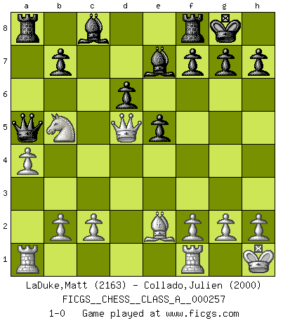 Last move : 1-0 2022 June 30 20:29:6 [Event "FICGS__CHESS__CLASS_A__000257"] [Site "FICGS"] [Date "2022.03.01"] [Round "1"] [White "LaDuke,Matt"] [Black "Collado,Julien"] [Result "1-0"] [WhiteElo "2163"] [BlackElo "2000"] 1.e4 c5 2.Nf3 Nc6 3.d4 cxd4 4.Nxd4 Nf6 5.Nc3 e5 6.Ndb5 d6 7.Nd5 Nxd5 8.exd5 Nb8 9.a4 Be7 10.Be2 O-O 11.Bd2 Nd7 12.O-O a6 13.Na3 a5 14.Kh1 Nb6 15.Nb5 Nxd5 16.Bxa5 Qxa5 17.Qxd5 1-0 This chess game has been lost on time (started : 2022.03.01 4:22:34) Sicilian : Pelikan (Lasker/Sveshnikov) variation Kingside Castling by player Black (move 10) Kingside Castling by player White (move 12) Player White won this chess game. Follow this game move after move (download)We must make sure that Chess will not be like a dead language, very interesting, but for a very small group. (Sytze Faber) Kein Großmeister ist normal. Sie unterscheiden sich nur im Ausmaß Ihrer Verrücktheit. (Viktor Kortschnoi) Tu sabes que vas a perder. Aún cuando tenía la ventaja, yo sabía que iba a perder. - al estar jugando con Fischer (Andrew Soltis) Il n'y a pas eu de défaite parce que je ne crois pas que cet ordinateur ait jamais existé. IBM a triché en refusant d'imprimer les modes de recherche de la machine. C'est évident, pendant le match, des coups décisifs ont été joués par des êtres humains. Aujourd'hui, les meilleurs spécialistes en informatique ne peuvent toujours pas expliquer comment Deep-Blue a pu jouer contre la logique des ordinateurs. IBM a gagné une guerre de communication, mais ils sont incapables de prouver que l'ordinateur a gagné tout seul. (Garry Kasparov) Your best chance to get a Royal Flush in a casino is in the bathroom. (Anonymous)