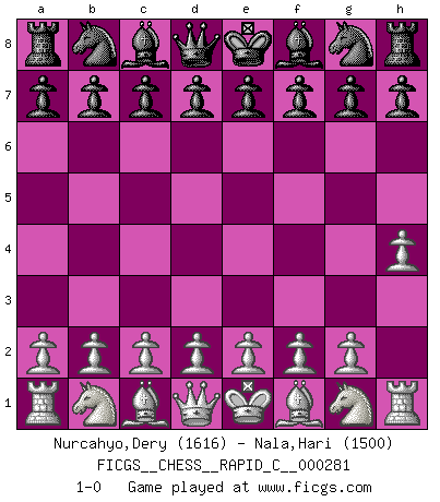 Last move : 1-0 2022 April 1 4:23:51 [Event "FICGS__CHESS__RAPID_C__000281"] [Site "FICGS"] [Date "2022.03.01"] [Round "1"] [White "Nurcahyo,Dery"] [Black "Nala,Hari"] [Result "1-0"] [WhiteElo "1616"] [BlackElo "1500"] 1.h4 1-0 This chess game has been lost on time (started : 2022.03.01 15:15:49) Anti-Borg (Desprez) Opening Player White won this chess game. Follow this game move after move (download)One doesn't have to play well, it's enough to play better than your opponent. (Siegbert Tarrasch) Es war undenkbar für die Behörden, dass ein sowjetischer Großmeister auf diese Art und Weise [Fischer-Taimanov 6:0] verliert, ohne dass es eine politischer Erklärung dafür gäbe. (Mark Taimanov) Me gusta decir que Bobby Fischer fue el mejor jugador que jamás haya existido. Pero lo que hizo de Fischer un genio, fue su habilidad de mezclar una frescura y pragmatismo Americano con ideas Rusas acerca de la estrategia. (Bruce Pandolfini) Les Echecs ont trois composantes : le temps, l'espace et le matériel en dernier. (Mikhail Tal) You must have a dream in order to have it come true. (A.P.J. Kalam)