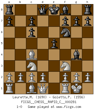Last move : 1-0 2022 April 7 14:9:27 [Event "FICGS__CHESS__RAPID_C__000281"] [Site "FICGS"] [Date "2022.03.01"] [Round "1"] [White "Leurette,Marc-Antoine"] [Black "Goletto,Piero Giuseppe"] [Result "1-0"] [WhiteElo "1690"] [BlackElo "1556"] 1.e4 e5 2.Nf3 Nf6 3.Nc3 Nc6 4.Bc4 d5 5.exd5 Bg4 6.dxc6 bxc6 7.O-O 1-0 This chess game has been lost on time (started : 2022.03.01 15:15:49) Petrov Three knights game Kingside Castling by player White (move 7) Player White won this chess game. Follow this game move after move (download)Fischer is the strongest player in the world. In fact, the strongest player who ever lived. (Larry Evans) Schach ist Leben. (Robert James Fischer) Diferente gente reacciona diferentemente en aceptar la derrota. (Bobby Fischer) 'L'échange des dames est un coup dur pour les deux adversaires...' Un journaliste lors d'une partie du match Spassky-Fischer SEO proverb : Make your website optimized for human beings, not for search engines.