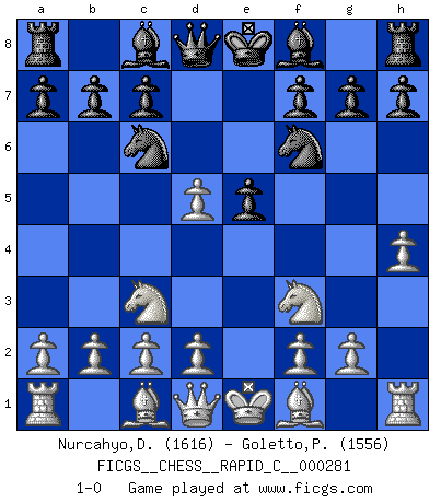 Last move : 1-0 2022 April 7 14:9:27 [Event "FICGS__CHESS__RAPID_C__000281"] [Site "FICGS"] [Date "2022.03.01"] [Round "1"] [White "Nurcahyo,Dery"] [Black "Goletto,Piero Giuseppe"] [Result "1-0"] [WhiteElo "1616"] [BlackElo "1556"] 1.h4 e5 2.Nc3 Nf6 3.e4 Nc6 4.Nf3 d5 5.exd5 1-0 This chess game has been lost on time (started : 2022.03.01 15:15:49) Anti-Borg (Desprez) Opening Player White won this chess game. Follow this game move after move (download)When you don't know what to do, wait for your opponent to get an idea - it's sure to be wrong. (Tarrasch) Ich glaube, ich kenne inzwischen die Gründe für mein Versagen: schachliche Charakterfehler. Ich war nie ein Wunderkind und in meiner gesamten menschlichen Entwicklung immer zu langsam. (Viktor Kortschnoi) Si el ingenio solamente fuese necesario para lucirse, las mujeres serían las mejores jugadoras de Ajedrez del mundo. (Albin) Karpov est une pièce de musée. (Garry Kasparov) Patience, use the Force, think ! (Obi-Wan Kenobi in Star Wars ep.2)
