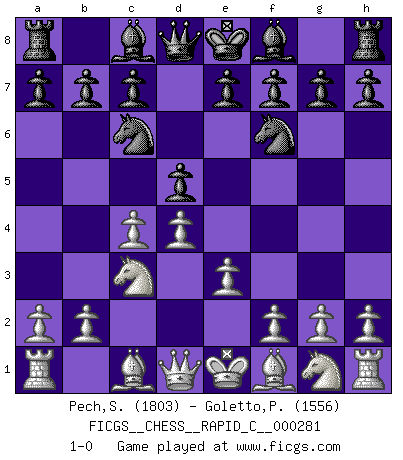 Last move : 1-0 2022 April 12 23:49:6 [Event "FICGS__CHESS__RAPID_C__000281"] [Site "FICGS"] [Date "2022.03.01"] [Round "1"] [White "Pech,Stepan"] [Black "Goletto,Piero Giuseppe"] [Result "1-0"] [WhiteElo "1803"] [BlackElo "1556"] 1.d4 d5 2.c4 Nc6 3.e3 Nf6 4.Nc3 1-0 This chess game has been lost on time (started : 2022.03.01 15:15:49) QGD : Chigorin defense Player White won this chess game. Follow this game move after move (download)The essence of Chess is thinking about what Chess is. (David Bronstein) Ich bin stolz ein Bulgare zu sein. (Veselin Topalov) Una de estas pequeñas movidas modestas pudieran ser mas molestas a tu oponente que la amenaza mas grande. (Siegbert Tarrasch) L'action d'une oeuvre littéraire se déroule sur un champ de bataille. Les masques et les types du drame moderne correspondent aux pièces du jeu d'échecs. L'intrigue correspond aux coups et aux gambits, c'est à dire aux techniques du jeu telles qu'utilisées et interprétées par les joueurs. Les tactiques et les péripéties [mouvements] correspondent aux coups exécutés par l'adversaire. (Viktor Shklovsky) Experience is the name we all give to our mistakes. (Oscar Wilde)