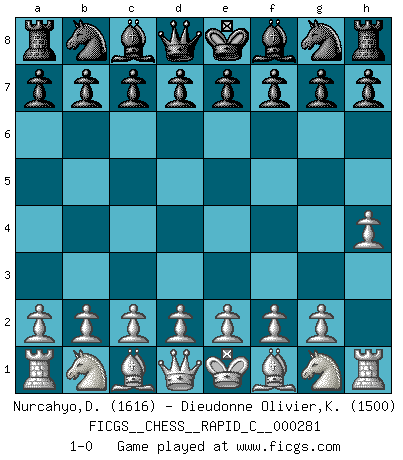 Last move : 1-0 2022 April 1 4:23:51 [Event "FICGS__CHESS__RAPID_C__000281"] [Site "FICGS"] [Date "2022.03.01"] [Round "1"] [White "Nurcahyo,Dery"] [Black "Dieudonne Olivier,Kourou"] [Result "1-0"] [WhiteElo "1616"] [BlackElo "1500"] 1.h4 1-0 This chess game has been lost on time (started : 2022.03.01 15:15:49) Anti-Borg (Desprez) Opening Player White won this chess game. Follow this game move after move (download)Chess is played with the mind and not with the hands ! (Renaud and Kahn) Ich verstehe Aljechins Kombinationen ganz gut; aber woher er diese Angriffschancen bekommt und wie er die Eröffnung behandelt das ist für mich ein Buch mit sieben Siegeln. (Rudolf Spielmann) Me gusta decir que Bobby Fischer fue el mejor jugador que jamás haya existido. Pero lo que hizo de Fischer un genio, fue su habilidad de mezclar una frescura y pragmatismo Americano con ideas Rusas acerca de la estrategia. (Bruce Pandolfini) Les écrivains ont utilisé les échecs pour analyser les côtés extrêmes de la nature humaine. Dans ce cadre, les échecs offrent un champ d'expérimentation idéal. Mais on pourrait faire la même chose avec la peinture. Et là, en vous référant à Van Gogh, vous ne tirerez pas de conclusion définitive sur les peintres. (Gary Kasparov) A shortcut is the longest distance between two points. (Don Groves)