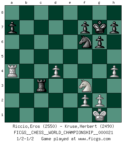 Last move : 1/2-1/2 2022 April 10 9:48:33 [Event "FICGS__CHESS__WORLD_CHAMPIONSHIP__000021"] [Site "FICGS"] [Date "2022.03.02"] [Round "3"] [White "Riccio,Eros"] [Black "Kruse,Herbert"] [Result "1/2-1/2"] [WhiteElo "2550"] [BlackElo "2490"] 1.e4 c5 2.c3 Nf6 3.e5 Nd5 4.Nf3 Nc6 5.Bc4 Nb6 6.Bb3 d5 7.exd6 Qxd6 8.O-O c4 9.Bc2 Bg4 10.Re1 Ne5 11.Rxe5 Bxf3 12.Qe1 Bc6 13.b3 g6 14.Ba3 Qc7 15.Be4 e6 16.Bxf8 Kxf8 17.Bxc6 Qxc6 18.Na3 Kg7 19.Qe2 Rhd8 20.Nc2 Nd7 21.Nd4 Qa6 22.Re3 Rac8 23.bxc4 e5 24.Nf3 Qxc4 25.Qe1 b6 26.h4 Qc7 27.d4 e4 28.Rxe4 Nf6 29.Re7 Re8 30.Rxc7 Rxe1+ 31.Rxe1 Rxc7 32.Rc1 b5 33.a4 bxa4 34.Ra1 Rxc3 35.Rxa4 1/2-1/2 Sicilian : Alapin's variation (2.c3) Kingside Castling by player White (move 8) This chess game ended in a draw. Follow this game move after move (download)Chess problems demand from the composer the same virtues that characterize all worthwhile art: originality, invention, conciseness, harmony, complexity, and splendid insincerity. (Vladimir Nabokov) Im Internet Chess Club betrug mein Rating vorübergehend 3350 ELO-Punkte. (Sergej Karjakin) Alguna parte de un error es siempre correcto. (Savielly Tartakover) Lorsque vous vous retrouvez devant une position atroce, ne tendez pas un ultime piège dérisoire avec l'intention d'abandonner si l'adversaire le déjoue ! Faites-vous plutôt un devoir de résister comme si votre vie en dépendait. Jouez le coup qui vous déplairait au centuple si vous étiez dans la peau de votre tortionnaire ! Even the best needles are not sharp at both ends. (Chinese proverb)