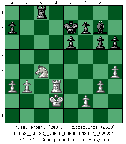 Last move : 1/2-1/2 2022 April 10 14:51:18 [Event "FICGS__CHESS__WORLD_CHAMPIONSHIP__000021"] [Site "FICGS"] [Date "2022.03.02"] [Round "8"] [White "Kruse,Herbert"] [Black "Riccio,Eros"] [Result "1/2-1/2"] [WhiteElo "2490"] [BlackElo "2550"] 1.c4 e6 2.Nf3 Nf6 3.g3 d5 4.d4 Bb4+ 5.Bd2 Be7 6.Bg2 O-O 7.O-O c6 8.Qc2 b6 9.Bf4 Nbd7 10.Nbd2 Ba6 11.Rfd1 Nh5 12.Be3 Nhf6 13.Bg5 Rc8 14.Rac1 h6 15.Bxf6 Nxf6 16.a3 Qe8 17.e4 Nxe4 18.Nxe4 dxe4 19.Qxe4 c5 20.dxc5 Rxc5 21.Ne5 Rc7 22.h4 Bb7 23.Qe3 Bxg2 24.Kxg2 Qa4 25.Qf4 R7c8 26.Rb1 b5 27.Rdc1 bxc4 28.Rxc4 Rxc4 29.Qxc4 Qxc4 30.Nxc4 Rc8 31.b3 Kf8 32.Kf3 g6 33.Ke2 Bf6 34.Rd1 Ke7 35.Rd3 Bg7 36.Kd2 1/2-1/2 English Opening Kingside Castling by player Black (move 6) Kingside Castling by player White (move 7) This chess game ended in a draw. Follow this game move after move (download)One of these modest little moves may be more embarrassing to your opponent than the biggest threat. (Siegbert Tarrasch) Modernes Schach erfordert enorme Anspannung. Es ist für einen normalen Menschen unmöglich das auszuhalten. (Viktor Kortschnoi) Tu sabes que vas a perder. Aún cuando tenía la ventaja, yo sabía que iba a perder. - al estar jugando con Fischer (Andrew Soltis) Toute estimation doit être constamment réévaluée. (Jacob Estrin) The modern world has divided itself into Conservatives and Progressives. The business of Progressives is to go on making mistakes. The business of the Conservatives is to prevent the mistakes from being corrected. (G.K. Chesterton)