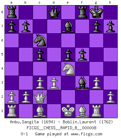 Last move : 0-1 2006 August 3 17:22:14 [Event "FICGS__CHESS__RAPID_B__000008"] [Site "FICGS"] [Date "2006.06.24"] [Round "1"] [White "Anbu,Sangita"] [Black "Boblin,Laurent"] [Result "0-1"] [WhiteElo "1694"] [BlackElo "1762"] 1.d3 d5 2.Nd2 Nf6 3.c3 e5 4.Qc2 c5 5.e4 Nc6 6.Ngf3 Be7 7.exd5 Nxd5 8.Be2 Nf4 9.Bf1 O-O 10.g3 Nh3 11.Ne4 Bg4 12.Ng1 Nxg1 13.Rxg1 f5 14.f3 Bxf3 0-1 Mieses Opening Kingside Castling by player Black (move 9) Player Black won this chess game. Follow this game move after move (download)Avoid the crowd. Do your own thinking independently. Be the Chess player, not the Chess piece. (Ralph Charell) Drei Punkte vor allen anderen ist wie einer, der im weißen Anzug posiert, während der Rest in Müllsäcke gekleidet dasteht. (Viktor Kortschnoi) Ayuda a tus piezas para que ellas te puedan ayudar. (Paul Morphy) Demandez au pauvre Cg1 ce qu'il en pense. Eduard Gufeld à propos de la variante Saemisch de l'Est-Indienne. Every now and then a man's mind is stretched by a new idea and never shrinks back to its former dimensions. (Oliver Wendell Holmes, Sr.)