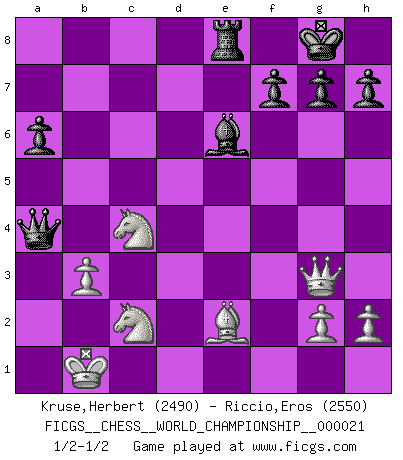 Last move : 1/2-1/2 2022 April 10 14:52:18 [Event "FICGS__CHESS__WORLD_CHAMPIONSHIP__000021"] [Site "FICGS"] [Date "2022.03.02"] [Round "12"] [White "Kruse,Herbert"] [Black "Riccio,Eros"] [Result "1/2-1/2"] [WhiteElo "2490"] [BlackElo "2550"] 1.c4 e6 2.d4 Nf6 3.Nc3 Bb4 4.f3 c5 5.d5 O-O 6.e4 b5 7.e5 Ne8 8.f4 exd5 9.cxd5 d6 10.Nf3 c4 11.a4 Nd7 12.Be2 Qb6 13.Bd2 Nc7 14.Nxb5 Bxd2+ 15.Nxd2 Nxd5 16.Nxc4 Qc5 17.Qd2 dxe5 18.fxe5 Nxe5 19.Nxe5 Ne3 20.Qc3 Nc2+ 21.Kd2 Nxa1 22.Rxa1 Rd8+ 23.Kc2 Qf2 24.Qf3 Qc5+ 25.Qc3 Qf2 26.Qf3 Qc5+ 27.Nc4 Bf5+ 28.Kb3 Rab8 29.Ka2 Be6 30.Rc1 a6 31.Nba3 Rd2 32.Kb1 Qb4 33.Rc2 Rxc2 34.Nxc2 Qxa4 35.Qg3 Re8 36.b3 1/2-1/2 English Opening Kingside Castling by player Black (move 5) This chess game ended in a draw. Follow this game move after move (download)You are for me the Queen on d8 and I am the Pawn on d7 !! (Eduard Gufeld) Es ist besser die Steine des Gegners zu opfern. (Savielly Grigorievitsch Tartakower) El Ajedrez moderno está demasiado preocupado con cosas como la estructura de Peones. Olvidenlo, el Jaque Mate termina la partida. (Nigel Short) Shah mat. Le roi est mort. Cri de fierté d'un joueur venant de terrasser son adversaire, courtoisement, sans effusion de sang. Logic : The art of thinking and reasoning in strict accordance with the limitations and incapacities of the human misunderstanding. (Ambrose Bierce)