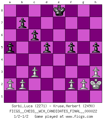 Last move : 1/2-1/2 2022 April 15 12:59:37 [Event "FICGS__CHESS__WCH_CANDIDATES_FINAL__000022"] [Site "FICGS"] [Date "2022.03.03"] [Round "2"] [White "Sorbi,Luca"] [Black "Kruse,Herbert"] [Result "1/2-1/2"] [WhiteElo "2271"] [BlackElo "2490"] 1.e4 e5 2.Nf3 Nc6 3.Bb5 Nf6 4.O-O Nxe4 5.Re1 Nd6 6.Nxe5 Be7 7.Bf1 Nxe5 8.Rxe5 O-O 9.d4 Bf6 10.Re1 Re8 11.c3 Rxe1 12.Qxe1 Ne8 13.Bf4 d5 14.Nd2 Bf5 15.Qe2 Nd6 16.Re1 c6 17.Qf3 Ne4 18.Nxe4 Bxe4 19.Qg3 h5 20.Qe3 g6 21.h3 Bf5 22.Be5 a5 23.Bd3 Bxe5 24.dxe5 Bxd3 25.Qxd3 Qg5 26.e6 Re8 27.exf7+ Kxf7 28.Qf3+ Qf5 29.Qxf5+ gxf5 30.Rxe8 Kxe8 31.Kh2 1/2-1/2 Ruy Lopez : Berlin defense, Open variation Kingside Castling by player White (move 4) Kingside Castling by player Black (move 8) This chess game ended in a draw. Follow this game move after move (download)I look one move ahead... the best ! (Siegbert Tarrasch) Ich rechne überhaupt nicht voraus. Ich gewinne auch so. (Robert James Fischer) El Ajedrez es un terrible juego. Si no controlas el centro, tu oponente tiene una posición mas holgada. Si tienes control del centro, ¡entonces realmente tu tienes algo de que preocuparte!. (Siegbert Tarrasch) L'action d'une oeuvre littéraire se déroule sur un champ de bataille. Les masques et les types du drame moderne correspondent aux pièces du jeu d'échecs. L'intrigue correspond aux coups et aux gambits, c'est à dire aux techniques du jeu telles qu'utilisées et interprétées par les joueurs. Les tactiques et les péripéties [mouvements] correspondent aux coups exécutés par l'adversaire. (Viktor Shklovsky) The beginning of wisdom is silence. The second step is listening. (Unknown)
