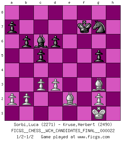 Last move : 1/2-1/2 2022 April 15 12:59:58 [Event "FICGS__CHESS__WCH_CANDIDATES_FINAL__000022"] [Site "FICGS"] [Date "2022.03.03"] [Round "4"] [White "Sorbi,Luca"] [Black "Kruse,Herbert"] [Result "1/2-1/2"] [WhiteElo "2271"] [BlackElo "2490"] 1.e4 e5 2.Nf3 Nc6 3.Bb5 Nf6 4.O-O Nxe4 5.Re1 Nd6 6.Nxe5 Be7 7.Bf1 Nxe5 8.Rxe5 O-O 9.Nc3 Bf6 10.Re1 Re8 11.Nd5 Rxe1 12.Qxe1 b6 13.Nxf6+ Qxf6 14.d3 Bb7 15.Qe3 c5 16.Qf4 Nf5 17.c3 h6 18.Bd2 Re8 19.Re1 Rxe1 20.Bxe1 Bc6 21.f3 d6 22.Bf2 g5 23.Qg4 Qe6 24.f4 f6 25.fxg5 fxg5 26.h4 Ng7 27.Qe2 Kf7 28.hxg5 hxg5 29.Bg3 Qxe2 30.Bxe2 1/2-1/2 Ruy Lopez : Berlin defense, Open variation Kingside Castling by player White (move 4) Kingside Castling by player Black (move 8) This chess game ended in a draw. Follow this game move after move (download)I give 98 percent of my mental energy to Chess. Others give only 2 percent. (Bobby Fischer) Wenn sie aufgeben, dann danke ich Ihnen für das Spiel (Eventualzug beim Fernschach). (Anonymous) Bobby solo arroja las piezas y solas caen en las casillas correctas. (Miguel Najdorf ) La conception d'un plan est le processus par lequel un joueur exploite les avantages de sa position tout en s'efforçant d'en réduire au minimum les inconvénients. Afin de garantir le succès, un plan doit toujours se fonder sur un diagnostic objectif des particularités d'une position. La conception d'un plan est d'autant plus difficile que la position est équilibrée, et grandement facilitée lorsqu'il n'existe qu'un seul plan susceptible de répondre aux exigences de la position. (Harry Golombek) A computer lets you make more mistakes faster than any invention in human history - with the possible exceptions of handguns and tequila. (Mitch Ratcliffe)