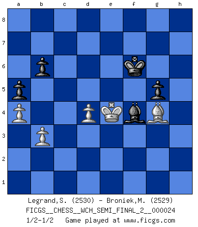 Last move : 1/2-1/2 2022 October 1 5:50:41 [Event "FICGS__CHESS__WCH_SEMI_FINAL_2__000024"] [Site "FICGS"] [Date "2022.03.04"] [Round "7"] [White "Legrand,Stephane"] [Black "Broniek,Mariusz Maciej"] [Result "1/2-1/2"] [WhiteElo "2530"] [BlackElo "2529"] 1.d4 Nf6 2.c4 e6 3.Nf3 d5 4.g3 Bb4+ 5.Bd2 Be7 6.Bg2 O-O 7.O-O c6 8.Qc2 b6 9.Ne5 Bb7 10.Rd1 Nbd7 11.cxd5 cxd5 12.Nc6 Bxc6 13.Qxc6 Rc8 14.Qb5 Ne8 15.Qd3 Nd6 16.Nc3 Nf6 17.b3 Qd7 18.a4 h5 19.Rac1 h4 20.Rc2 Rc6 21.Rdc1 Rfc8 22.e3 R8c7 23.Bf3 g6 24.Be1 hxg3 25.hxg3 Kg7 26.Ne2 Nf5 27.Rxc6 Rxc6 28.Qd1 Qc8 29.Rxc6 Qxc6 30.Nf4 Bd6 31.Nd3 Nh6 32.Nb4 Qc8 33.Be2 Qf8 34.Nc6 Qa8 35.Ne5 Qc8 36.Bd3 Nd7 37.Nf3 f5 38.Ng5 Nf8 39.Kg2 Qd8 40.f4 Qc8 41.Qc2 Qxc2+ 42.Bxc2 Ng4 43.Bd2 Bb4 44.Bc1 Ba3 45.Bd2 Be7 46.Nf3 Nh7 47.Bd3 a5 48.Ba6 Nhf6 49.Bc8 Ne4 50.Bxe6 Kf6 51.Bd7 Nxd2 52.Nxd2 Nxe3+ 53.Kf2 Nd1+ 54.Ke2 Nc3+ 55.Kd3 Bb4 56.Nf1 Ne4 57.Ne3 Ke7 58.Bc6 Nf6 59.Nxd5+ Nxd5 60.Bxd5 Be1 61.g4 fxg4 62.Bg2 Kf6 63.Ke4 Bd2 64.Bf1 g5 65.Be2 Bxf4 66.Bxg4 1/2-1/2 Queen's pawn game Kingside Castling by player Black (move 6) Kingside Castling by player White (move 7) 10 pieces endgame at move 66 : White KBPPP , Black KBPPP WHITE : King + 1 Bishop 3 Pawns BLACK : King + 1 Bishop 3 Pawns This chess game ended in a draw. Follow this game move after move (download)Discovered check is the dive bomber of the Chessboard. (Reuben Fine) Obwohl ich alt bin, darf mir niemand den Finger in den Mund stecken, sonst beisse ich. (Wilhelm Steinitz) El Ajedrez hace al hombre ser mas sabio y ver mas claro. (Vladimir Putin) Les Cavaliers se révèlent fort utiles dans les positions fermées. D'habitude, les Fous sont un peu plus forts que les Cavaliers dans les positions ouvertes. Qu'on le veuille ou non, il restera toujours des exceptions ! Now be brave and don't look back. Don't look back. (Shmi Skywalker in Star Wars ep.1)