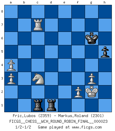 Last move : 1/2-1/2 2022 June 24 8:20:28 [Event "FICGS__CHESS__WCH_ROUND_ROBIN_FINAL__000023"] [Site "FICGS"] [Date "2022.03.04"] [Round "1"] [White "Fric,Lubos"] [Black "Markus,Roland"] [Result "1/2-1/2"] [WhiteElo "2359"] [BlackElo "2301"] 1.e4 e5 2.Nf3 Nc6 3.d4 exd4 4.Nxd4 Nf6 5.Nxc6 bxc6 6.e5 Qe7 7.Qe2 Nd5 8.c4 Ba6 9.b3 g6 10.g3 Bg7 11.Bb2 O-O 12.Bg2 Rae8 13.O-O Bxe5 14.Bxe5 Qxe5 15.Qxe5 Rxe5 16.cxd5 Bxf1 17.Kxf1 cxd5 18.Na3 c6 19.Nc2 Kg7 20.Rd1 Rb8 21.Bf3 a5 22.Be2 Re7 23.h4 h5 24.Rd3 Re6 25.Bd1 Kf6 26.Rd2 Re5 27.Nd4 Re7 28.Rd3 a4 29.bxa4 Rb2 30.a3 c5 31.Nb5 d4 32.Rf3+ Kg7 33.Bb3 Rb1+ 34.Kg2 R7e1 35.Rxf7+ Kh6 36.Bc4 d5 37.Bxd5 d3 38.Nc3 d2 39.Rc7 Rbc1 40.Bg8 g5 41.hxg5+ Kxg5 42.Rxc5+ Kh6 43.Rc6+ Kg7 44.Bb3 d1Q 45.Bxd1 Rexd1 46.Rc7+ Kg6 1/2-1/2 Scotch : Mieses variation Kingside Castling by player Black (move 11) Kingside Castling by player White (move 13) Promotion Queen by player Black (move 44) This chess game ended in a draw. Follow this game move after move (download)I have never in my life played the French Defence, which is the dullest of all openings. (Wilhelm Steinitz) Das typische an einem Großmeister ist, daß er eine gewonnene Position schnell und schmerzlos gewinnt. (Irving Chernev) Antes de los Finales, los dioses han colocado el Juego Medio. (Siegbert Tarrasch) On entre au jeu d'Echecs comme on entre en Religion. Pour le joueur d'Echecs, la partie d'Echecs c'est l'office, la messe, le défilé du 1er Mai, le dépôt de gerbe au Monument aux Morts. C'est un drame sacré. (Michel Roos) Treat your password like your toothbrush. Don't let anybody else use it, and get a new one every six months. (Clifford Stoll)