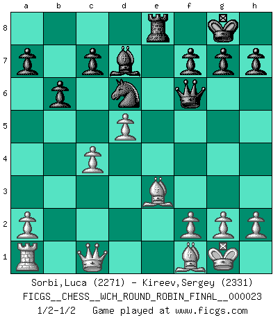 Last move : 1/2-1/2 2022 April 1 18:38:4 [Event "FICGS__CHESS__WCH_ROUND_ROBIN_FINAL__000023"] [Site "FICGS"] [Date "2022.03.04"] [Round "1"] [White "Sorbi,Luca"] [Black "Kireev,Sergey"] [Result "1/2-1/2"] [WhiteElo "2271"] [BlackElo "2331"] 1.e4 e5 2.Nf3 Nc6 3.Bb5 Nf6 4.O-O Nxe4 5.Re1 Nd6 6.Nxe5 Be7 7.Bf1 Nxe5 8.Rxe5 O-O 9.Nc3 Bf6 10.Re1 Re8 11.Nd5 Rxe1 12.Qxe1 b6 13.Nxf6+ Qxf6 14.c3 Bb7 15.d4 Re8 16.Qd2 Bc6 17.b3 Ne4 18.Qe1 d5 19.Be3 Nd6 20.Qc1 Bb5 21.c4 dxc4 22.bxc4 Bd7 23.d5 1/2-1/2 Ruy Lopez : Berlin defense, Open variation Kingside Castling by player White (move 4) Kingside Castling by player Black (move 8) This chess game ended in a draw. Follow this game move after move (download)The essence of Chess is thinking about what Chess is. (David Bronstein) Herr Iljumschinow ist ein etwas merkwürdiger Geschäftsmann: Er arbeitet zusammen mit Leuten wie Muammar al-Gaddafi; früher ist das Saddam Hussein gewesen. (Joel Lautier) Uno no tiene que jugar muy bien, es suficiente jugar mejor que el oponente. (Siegbert Tarrasch) Roi des jeux et jeu des rois, les échecs portent en eux un sentiment d'infini. Ils donnent à celui qui s'est efforcé d'en approfondir les arcanes l'impression de n'être pas à la mesure de l'homme; en fait, ils constituent un résumé de l'univers, un microcosme, et figurent cette grande échelle qui, dans les plans de la lumière descend jusqu'à la matière, qui des abîmes insondables remonte jusqu'en l'infini de Dieu. (Pyrame) There are two kinds of tragedy in this world, one is not getting what you want and the other is getting. (Lord of war)