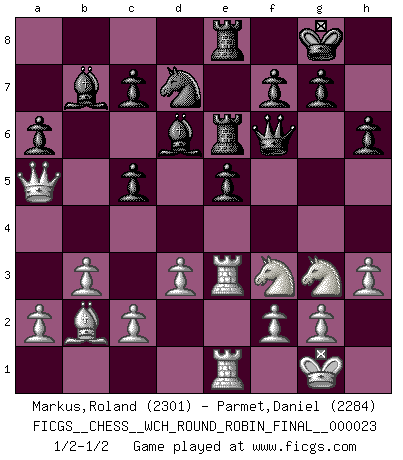 Last move : 1/2-1/2 2022 April 15 19:22:8 [Event "FICGS__CHESS__WCH_ROUND_ROBIN_FINAL__000023"] [Site "FICGS"] [Date "2022.03.04"] [Round "1"] [White "Markus,Roland"] [Black "Parmet,Daniel"] [Result "1/2-1/2"] [WhiteElo "2301"] [BlackElo "2284"] 1.e4 e5 2.Nf3 Nc6 3.Bb5 Nf6 4.Nc3 Bd6 5.d3 O-O 6.O-O h6 7.Ne2 Re8 8.Ng3 Bf8 9.h3 a6 10.Bxc6 bxc6 11.b3 d5 12.Bb2 Nd7 13.Re1 Qf6 14.Bc3 Bb7 15.Qd2 c5 16.exd5 Bxd5 17.Re3 Re6 18.Rae1 Rae8 19.Bb2 Bd6 20.Qa5 Bb7 21.Nd2 Qg6 22.Nf3 Qf6 23.Nd2 Qg6 24.Nf3 Qf6 1/2-1/2 Ruy Lopez : Berlin defense Kingside Castling by player Black (move 5) Kingside Castling by player White (move 6) This chess game ended in a draw. Follow this game move after move (download)Fischer wanted to give the Russians a taste of their own medicine. (Larry Evans) Schach ist eine Sache der genauen Beurteilung, wann man zuschlagen und wann man sich ducken muss. (Robert James Fischer) Robert Fischer es la ley hacia si mismo. (Larry Evans) Les échecs, c'est la lutte contre l'erreur. (Johannes Zukertort) The Movers & Shakers of this world are those who play chess in the mornings and go to the disco in the evenings. (Dinesh De Silva)