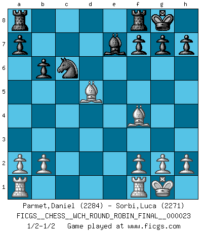 Last move : 1/2-1/2 2022 April 8 3:55:50 [Event "FICGS__CHESS__WCH_ROUND_ROBIN_FINAL__000023"] [Site "FICGS"] [Date "2022.03.04"] [Round "1"] [White "Parmet,Daniel"] [Black "Sorbi,Luca"] [Result "1/2-1/2"] [WhiteElo "2284"] [BlackElo "2271"] 1.d4 Nf6 2.c4 e6 3.Nf3 d5 4.Nc3 Be7 5.Bf4 O-O 6.e3 b6 7.cxd5 Nxd5 8.Nxd5 Qxd5 9.Be2 Qa5+ 10.Nd2 Ba6 11.O-O c5 12.Nc4 Bxc4 13.Bxc4 cxd4 14.exd4 Nc6 15.d5 exd5 16.Qxd5 Qxd5 17.Bxd5 1/2-1/2 Queen's pawn game Kingside Castling by player Black (move 5) Kingside Castling by player White (move 11) This chess game ended in a draw. Follow this game move after move (download)The boy (then a 12 year old boy named Anatoly Karpov) doesn't have a clue about Chess, and there's no future at all for him in this profession. (Mikhail Botvinnik) Das Schachspiel hat wie die Liebe, die Musik, die Fähigkeit, den Menschen glücklich zu machen. Ich habe ein leises Gefühl des Bedauerns für jeden, der das Schachspiel nicht kennt, so wie ich jeden bedaure, der die Liebe nicht kennt. (Siegbert Tarrasch) ¿Quién es tu oponente esta tarde? Esta tarde mi oponente son las piezas negras. (Akiba Rubinstein) Même un GMI sait rarement calculer sur plus de cinq coups une attaque à sacrifices. (Rudolf Spielmann) Luck is when opportunity knocks and you answer. (Anonymous)