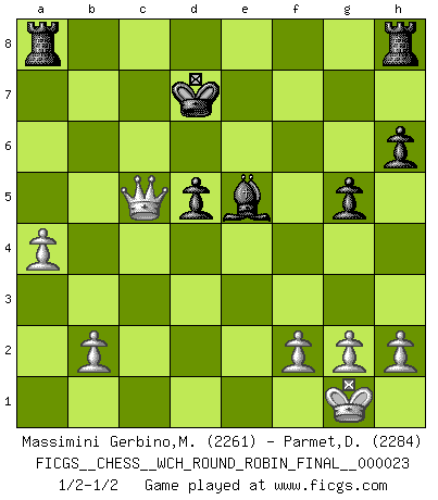 Last move : 1/2-1/2 2022 May 19 9:18:52 [Event "FICGS__CHESS__WCH_ROUND_ROBIN_FINAL__000023"] [Site "FICGS"] [Date "2022.03.04"] [Round "1"] [White "Massimini Gerbino,Massimiliano"] [Black "Parmet,Daniel"] [Result "1/2-1/2"] [WhiteElo "2261"] [BlackElo "2284"] 1.d4 d5 2.c4 c6 3.Nf3 Nf6 4.Nc3 e6 5.Bg5 h6 6.Bh4 dxc4 7.e4 g5 8.Bg3 b5 9.Be2 Bb7 10.O-O Nbd7 11.Ne5 Bg7 12.Nxd7 Nxd7 13.Bd6 a6 14.a4 b4 15.Bxb4 Qb6 16.Ba3 Qxd4 17.Qc2 c5 18.Rad1 Qe5 19.Bxc4 Qc7 20.Bb5 axb5 21.Nxb5 Qc6 22.Rd6 Qxe4 23.Rxe6+ Qxe6 24.Nc7+ Kd8 25.Nxe6+ fxe6 26.Bxc5 Nxc5 27.Qxc5 Bd5 28.Rc1 Be5 29.Rd1 Kd7 30.Rxd5+ exd5 1/2-1/2 QGD Slav : 4.Nc3 Kingside Castling by player White (move 10) This chess game ended in a draw. Follow this game move after move (download)Checkers is for tramps. (Paul Morphy) Der Freibauer hat für mich eine Seele, genau wie der Mensch, Wünsche, die unerkannt in ihm schlummern, und Befürchtungen, von deren Existenz er selbst kaum ahnt. (Aaron Nimzowitsch) No puedes jugar al Ajedrez si eres de corazón noble. (Proverbio Francés) Un footballeur joue avec ses pieds, parfois avec sa tête. Un joueur d'échecs ne joue qu'avec sa tête. Et quand il ne joue plus, il meurt. (Jacob Murray) Ah, beer! The cause of, and the solution to, all of life's problems. (Homer Simpson)