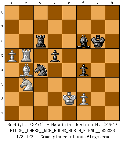 Last move : 1/2-1/2 2022 August 4 15:42:43 [Event "FICGS__CHESS__WCH_ROUND_ROBIN_FINAL__000023"] [Site "FICGS"] [Date "2022.03.04"] [Round "1"] [White "Sorbi,Luca"] [Black "Massimini Gerbino,Massimiliano"] [Result "1/2-1/2"] [WhiteElo "2271"] [BlackElo "2261"] 1.d4 d5 2.c4 Nf6 3.cxd5 Nxd5 4.Nf3 g6 5.e4 Nb6 6.h3 Bg7 7.Nc3 Nc6 8.Be3 O-O 9.Bb5 Na5 10.Qc1 c6 11.Be2 Nac4 12.Bg5 Nd6 13.O-O f5 14.e5 Nf7 15.Bd2 Be6 16.Re1 a5 17.h4 a4 18.Bd1 Qc8 19.Ne2 Bd5 20.Nf4 e6 21.Nxd5 Nxd5 22.b3 axb3 23.Bxb3 Qd7 24.a4 Rfb8 25.g3 Bf8 26.Qc2 Ra6 27.h5 Be7 28.hxg6 hxg6 29.g4 Kg7 30.gxf5 gxf5 31.Kf1 b5 32.a5 Rg8 33.Ke2 Kf8 34.Rg1 Rxg1 35.Rxg1 b4 36.Ra1 Qd8 37.Qa2 Qa8 38.Ne1 Qa7 39.Nc2 Qb7 40.Bc4 c5 41.Qb3 cxd4 42.Bxd5 exd5 43.Nxd4 Nxe5 44.Qg3 Bf6 45.Rc1 b3 46.Qxb3 Qxb3 47.Rc8+ Kf7 48.Nxb3 Nc4 49.Bb4 f4 50.Rb8 Rc6 51.Rb7+ Kg6 52.Rb5 1/2-1/2 QGD : Marshall defense Kingside Castling by player Black (move 8) Kingside Castling by player White (move 13) This chess game ended in a draw. Follow this game move after move (download)The most important feature of the Chess position is the activity of the pieces. This is absolutely fundamental in all phases of the game: Opening, Middlegame and especially Endgame. The primary constraint on a piece's activity is the Pawn structure. (Michael Stean) Die unerbitterlichsten Regeln im Schach sind die Ausnahmen. (Savielly Grigorievitsch Tartakower) Preferería tener un Peón que un dedo. (Reuben Fine) Botvinnik disait en comparant les échecs à la musique: Il existe une science dont le but est l'étude de l'acoustique et des sons. Mais il y a aussi un art qui se sert de l'océan des sons : c'est la musique. De toute évidence, il en est de même pour la pensée. La logique est l'étude des lois de la réflexion et les échecs reflètent, en tant qu'art, le côté logique de la réflexion, sous la forme d'images artistiques... Extrait de Fischer - Spassky, Reykjavik 1972 par Alexander & F. Wyndham (Ed. Solar), p 37. Somewhere in the world there is an epigram for every dilemma. (Hendrik Willem van Loon)