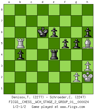 Last move : 1/2-1/2 2022 August 11 21:45:32 [Event "FICGS__CHESS__WCH_STAGE_2_GROUP_01__000024"] [Site "FICGS"] [Date "2022.03.05"] [Round "1"] [White "Denisov,Timofey"] [Black "Schroeder,Christoph"] [Result "1/2-1/2"] [WhiteElo "2277"] [BlackElo "2247"] 1.d4 d5 2.c4 e6 3.Nf3 Nf6 4.Nc3 Be7 5.Bf4 O-O 6.e3 b6 7.Bd3 c5 8.dxc5 dxc4 9.Bxc4 Qxd1+ 10.Rxd1 Bxc5 11.O-O Ba6 12.Nb5 Nc6 13.a3 Rfc8 14.h3 Nd5 15.Bg3 Bxe3 16.fxe3 Nxe3 17.b3 h6 18.Rde1 Nxf1 19.Bxf1 Bxb5 20.Bxb5 a6 21.Be2 b5 22.Ra1 Na5 23.Nd4 Rd8 24.b4 Rxd4 25.bxa5 Rc8 26.Bf3 R8c4 27.Be1 Rc7 28.Bg3 R7c4 29.Bf2 Rd7 30.Be2 Re4 31.Kf1 Rd2 32.Bf3 Ra4 33.Be3 Rd3 34.Bc5 Rc3 35.Bb4 Rb3 36.Bc5 Rc3 37.Bd6 Rd3 38.Be7 Rxa5 39.Bd1 Rd4 40.Rb1 g5 41.Kg1 f5 42.Bc5 Rc4 43.Bb4 Rxb4 44.axb4 Ra3 45.Kh2 Kf7 46.Rc1 Kf6 47.Rc6 Ke7 48.Rb6 Rd3 49.Be2 Rd2 50.Bh5 Rd4 51.Rxa6 Rxb4 52.Ra7+ Kd6 53.Ra6+ Ke7 54.Rb6 Rh4 55.Be2 b4 56.Kg1 Rf4 57.Bd1 Rd4 58.Be2 Rf4 59.Bh5 Rh4 60.Bf3 Rf4 61.Be2 Kf6 62.Bf3 Ke7 63.Kh2 Rc4 64.Rb7+ Kf6 65.Rb6 Ke7 66.Be2 Re4 67.Bd3 Rd4 68.Be2 Re4 69.Bd1 Rd4 70.Bb3 Re4 71.Bc2 Rc4 72.Bb3 Re4 73.Bd1 Rd4 74.Bh5 Rh4 75.Rb7+ Kf6 76.Be2 Rd4 77.Kg3 Ke5 78.Rb5+ Kd6 79.Bh5 Kc6 80.Re5 Kd6 81.Rb5 Kc6 82.Be8+ Kc7 83.Bf7 Re4 84.Kf2 Kc6 85.Be8+ Kd6 86.Bg6 Rf4+ 87.Kg3 Re4 88.Kh2 Kc6 89.Be8+ Kd6 90.Bh5 Kc6 91.Be8+ Kd6 92.Bh5 1/2-1/2 Queen's gambit declined Kingside Castling by player Black (move 5) Kingside Castling by player White (move 11) This chess game ended in a draw. Follow this game move after move (download)Fischer prefers to enter Chess history alone. (Miguel Najdorf) Über Frauen: Chess is better. (Robert James Fischer) Un entendimiento minucioso de las típicas continuaciones de mate hacen de las mas complicadas combinaciones de sacrificio que conducen hacia ellas no solo no dificiles, sino casi un asunto de rutina. (Siegbert Tarrasch) Aidez vos pièces, elles vous aideront. (Paul Morphy) Convictions are more dangerous enemies of truth than lies. (Friedrich Nietzsche)