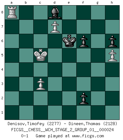 Last move : 0-1 2022 August 18 11:22:47 [Event "FICGS__CHESS__WCH_STAGE_2_GROUP_01__000024"] [Site "FICGS"] [Date "2022.03.05"] [Round "1"] [White "Denisov,Timofey"] [Black "Dineen,Thomas"] [Result "0-1"] [WhiteElo "2277"] [BlackElo "2128"] 1.e4 e6 2.d4 d5 3.Nc3 Nf6 4.e5 Nfd7 5.f4 c5 6.Nf3 Nc6 7.Be3 cxd4 8.Nxd4 Qb6 9.Qd2 Qxb2 10.Rb1 Qa3 11.Bb5 Nxd4 12.Bxd4 a6 13.Bxd7+ Bxd7 14.Rb3 Qe7 15.Rxb7 Rc8 16.O-O Qd8 17.f5 exf5 18.Rfb1 Qa5 19.Qg5 Be6 20.Ne2 h6 21.Qg3 g5 22.c3 Qxa2 23.Qf3 Qc4 24.h4 Rg8 25.R1b6 Rg6 26.h5 Rg8 27.Ra7 Rg7 28.Rbxa6 Be7 29.Ra4 Qc6 30.Qd3 Kf8 31.R7a6 Qd7 32.Ra7 Qc6 33.R4a6 Qc4 34.Qxc4 dxc4 35.Bb6 Re8 36.Nd4 Kg8 37.Nb5 Bd8 38.Bd4 Kh7 39.Nd6 Re7 40.Rxe7 Bxe7 41.Ne8 Rg8 42.Nc7 Bd7 43.Ra7 Bc6 44.e6 f6 45.Na6 Rg7 46.Nb8 Bd5 47.Ra6 Bb7 48.Ra5 Bc8 49.Nd7 Bxd7 50.exd7 Rg8 51.Ra7 Bd8 52.Kf2 Kg7 53.Ke3 Kf7 54.Bc5 Ke6 55.Kd4 g4 56.Kxc4 f4 57.Kb5 Rg5 58.Kc6 f3 59.gxf3 gxf3 60.Ra8 Rxc5+ 61.Kxc5 f2 0-1 This chess game has been lost on time (started : 2022.03.05 0:42:37) French : Steinitz, Boleslavsky variation Kingside Castling by player White (move 16) 10 pieces endgame at move 61 : White KRPPP , Black KBPPP WHITE : King + 1 Rook 3 Pawns BLACK : King + 1 Bishop 3 Pawns Player Black won this chess game. Follow this game move after move (download)The tactician knows what to do when there is something to do; whereas the strategian knows what to do when there is nothing to do. (Gerald Abrahams) Schach verlangt totale Konzentration. (Robert James Fischer) Todo lo que importa ante el tablero de Ajedrez son buenas jugadas. (Bobby Fischer) Votre seul travail dans les ouvertures est d'obtenir un milieu de partie jouable. (Lajos Portish) If I had no sense of humor, I would long ago have committed suicide. (Mahatma Gandhi)