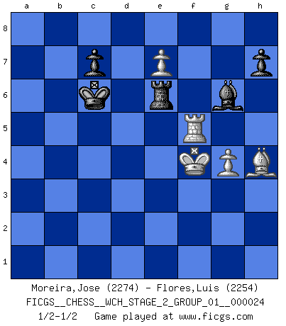 Last move : 1/2-1/2 2022 June 13 3:17:34 [Event "FICGS__CHESS__WCH_STAGE_2_GROUP_01__000024"] [Site "FICGS"] [Date "2022.03.05"] [Round "1"] [White "Moreira,Jose"] [Black "Flores,Luis"] [Result "1/2-1/2"] [WhiteElo "2274"] [BlackElo "2254"] 1.e4 e5 2.Nf3 Nf6 3.Nxe5 d6 4.Nf3 Nxe4 5.d4 d5 6.Bd3 Nc6 7.O-O Be7 8.Nbd2 Nxd2 9.Bxd2 Bg4 10.c3 O-O 11.h3 Bh5 12.g3 Qd7 13.Kg2 Bg6 14.Bf4 Be4 15.Re1 f5 16.Kh2 Bd6 17.Ne5 Bxe5 18.dxe5 Qe7 19.Bb5 g5 20.Bxc6 bxc6 21.Bd2 g4 22.Bf4 Qe6 23.Qd4 Rfb8 24.b3 a5 25.Rad1 Re8 26.c4 Bf3 27.Rd2 a4 28.cxd5 Bxd5 29.Bg5 Qg6 30.Bf6 axb3 31.axb3 Ra3 32.e6 Rxb3 33.e7 f4 34.Bh4 Rf3 35.hxg4 Qxg4 36.Rd3 fxg3+ 37.fxg3 Qxd4 38.Rxd4 Kf7 39.Kg1 Rf5 40.R4d1 Kg7 41.Rc1 Kf7 42.Rc5 Rb8 43.Ra5 Ke8 44.Rea1 Re5 45.Ra8 Re1+ 46.Kf2 Reb1 47.Ke3 c5 48.Rxb8+ Rxb8 49.Ra5 Bf7 50.Rxc5 Kd7 51.Rf5 Ke8 52.Ra5 Kd7 53.Rf5 Be8 54.Rc5 Rb6 55.Kf4 Re6 56.Rd5+ Kc6 57.Rf5 Bg6 58.g4 1/2-1/2 Petrov : Classical attack Kingside Castling by player White (move 7) Kingside Castling by player Black (move 10) 10 pieces endgame at move 50 : White KRBPP , Black KRBPP WHITE : King + 1 Rook 1 Bishop 2 Pawns BLACK : King + 1 Rook 1 Bishop 2 Pawns This chess game ended in a draw. Follow this game move after move (download)At this time Fischer is simply a level above all the best Chessplayers in the world. (John Jacobs) Vom Schach wurde gesagt das Leben sei dafür nicht lange genug. Aber das ist der Fehler des Lebens, nicht des Schach'. (Irving Chernev) Aquellos que dicen que entienden al Ajedrez, no entienden nada. (Robert Hubner) Il s'avisa de me proposer d'apprendre les échecs qu'il jouait un peu... me voilà forcené des échecs. J'achète un échiquier, je m'enferme dans ma chambre, j'y passe des jours et des nuits à vouloir apprendre par cur toutes les parties. (Jean-Jacques Rousseau, Confessions) In fact if nothing is done against this teddy bear, hereby I announce that I would quit chess, rapid chess, blitz chess, postal chess, email chess, server chess and correspondence chess I will then switch to a table game where teddy bears aren't going to be seen for a while, like Poker, or Roulette, all 18+ games. (Elmer Valderrama)