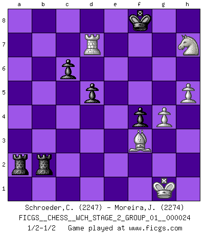Last move : 1/2-1/2 2022 March 29 11:32:35 [Event "FICGS__CHESS__WCH_STAGE_2_GROUP_01__000024"] [Site "FICGS"] [Date "2022.03.05"] [Round "1"] [White "Schroeder,Christoph"] [Black "Moreira,Jose"] [Result "1/2-1/2"] [WhiteElo "2247"] [BlackElo "2274"] 1.e4 e5 2.Nf3 Nc6 3.d4 exd4 4.Nxd4 Nf6 5.Nxc6 bxc6 6.e5 Qe7 7.Qe2 Nd5 8.c4 Ba6 9.b3 g6 10.g3 Bg7 11.Bb2 O-O 12.Bg2 Rae8 13.O-O Bxe5 14.Qxe5 Qxe5 15.Bxe5 Rxe5 16.cxd5 Bxf1 17.Kxf1 cxd5 18.Nc3 c6 19.Rd1 Rb8 20.Bf3 a5 21.Na4 Re7 22.h4 f5 23.Rc1 h6 24.Nc5 Rb4 25.h5 g5 26.a3 Rd4 27.Nb7 f4 28.g4 Rd3 29.Nc5 Rd2 30.b4 axb4 31.axb4 Rb2 32.Nb7 Rxb4 33.Nd6 Re6 34.Nf5 Ra4 35.Rb1 Kf8 36.Kg2 Ra7 37.Nd4 Re8 38.Nf5 Rea8 39.Nxh6 Ra1 40.Rb7 Rc1 41.Rxd7 Ra2 42.Nf7 R1c2 43.Nxg5 Rxf2+ 44.Kg1 Rfb2 45.Nh7+ Ke8 46.Nf6+ Kf8 47.Nh7+ Ke8 48.Nf6+ Kf8 49.Nh7+ 1/2-1/2 Scotch : Mieses variation Kingside Castling by player Black (move 11) Kingside Castling by player White (move 13) This chess game ended in a draw. Follow this game move after move (download)It is not enough to be a good player... you must also play well. (Siegbert Tarrasch) Wenn Dein Gegner dir ein Remis anbietet, versuch herauszufinden, weshalb er glaubt schlechter zu stehen. (Nigel Short) El sobresalir en el Ajedrez es un signo de una mente intrigante. (Sir Arthur Conan Doyle) D'abord les bases : Jouez et étudiez, puis étudiez et jouez, ensuite jouez et étudiez, puis étudiez et jouez. Deuxièmement : Donnez toujours le meilleur de vous-même ! (Ken Smith) If we knew what we were doing, we would not call it research. (Albert Einstein)
