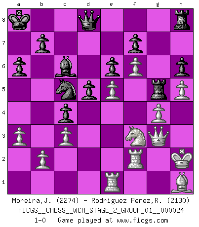 Last move : 1-0 2022 August 6 16:30:2 [Event "FICGS__CHESS__WCH_STAGE_2_GROUP_01__000024"] [Site "FICGS"] [Date "2022.03.05"] [Round "1"] [White "Moreira,Jose"] [Black "Rodriguez Perez,Rene"] [Result "1-0"] [WhiteElo "2274"] [BlackElo "2130"] 1.e4 e6 2.d4 d5 3.Nc3 Nf6 4.e5 Nfd7 5.f4 c5 6.Nf3 Nc6 7.Be3 a6 8.a3 h6 9.Ne2 Qb6 10.Rb1 Qc7 11.c3 c4 12.g4 Nb6 13.Ng3 Bd7 14.Bh3 Be7 15.f5 O-O-O 16.O-O Kb8 17.Kh1 Ka7 18.Qc2 Qc8 19.Rbe1 Rdg8 20.Nh5 Bd8 21.f6 gxf6 22.exf6 Bc7 23.Qd2 Qb8 24.Rg1 Qf8 25.Bf4 Bxf4 26.Qxf4 Nb8 27.Rg2 Bc6 28.Rf2 N8d7 29.Bg2 Rh7 30.h3 Qd8 31.Qd6 Nc8 32.Qf4 Nf8 33.Qe3 Nb6 34.Kh2 Ng6 35.Nd2 R7h8 36.Bh1 Ka8 37.Qg3 Nc8 38.Nf3 Nd6 39.Ne5 Nxe5 40.dxe5 Nc8 41.Nf4 Nb6 42.Ne2 Nd7 43.Nd4 Rg6 44.h4 Nc5 45.h5 Rg5 46.Nf3 1-0 This chess game has been lost on time (started : 2022.03.05 0:42:37) French : Steinitz, Boleslavsky variation Queenside Castling by player Black (move 15) Kingside Castling by player White (move 16) Player White won this chess game. Follow this game move after move (download)Every Pawn is a potential Queen. (James Mason) Schon mancher Spieler hat aufgegeben, um zu vermeiden, daß er eine Figur verliert. (Savielly Grigorievitsch Tartakower) Cuando estes solo, cuando te sientas un extraño en el mundo, juega al Ajedrez. Esto levantará tu espiritu y será tu consejero de guerra. (Aristóteles) Les Echecs sont affaire de jugement sensible. Savoir quand frapper et quand esquiver. (Fischer) For peace of mind, resign as general manager of the universe. (Douglas Adams)