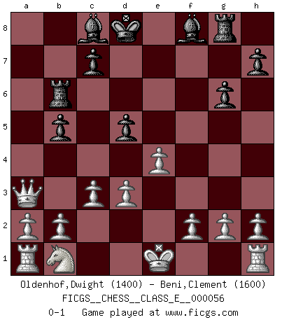 Last move : 0-1 2007 November 13 7:10:34 [Event "FICGS__CHESS__CLASS_E__000056"] [Site "FICGS"] [Date "2007.07.30"] [Round "1"] [White "Oldenhof,Dwight"] [Black "Beni,Clement"] [Result "0-1"] [WhiteElo "1400"] [BlackElo "1600"] 1.e4 e5 2.Nf3 Nc6 3.Bb5 a6 4.Ba4 b5 5.Bb3 Nd4 6.Nxd4 exd4 7.Bxf7+ Ke7 8.Bxg8 Rxg8 9.Qh5 Rh8 10.d3 d6 11.Bg5+ Kd7 12.Bxd8 Kxd8 13.c3 g6 14.Qd5 Rb8 15.Qxd4 Rg8 16.Qa7 Rb7 17.Qxa6 Rb6 18.Qa3 d5 0-1 This chess game has been lost on time (started : 2007.07.30 11:9:57) Ruy Lopez : Caro variation Player Black won this chess game. Follow this game move after move (download)Mistrust is the most necessary characteristic of the Chess player. (Siegbert Tarrasch) Irgendwie scheint mir sonntags früh um 9 Uhr der Killerinstinkt verloren gegangen zu sein. (Alexej Shirov) La esencia del Ajedrez es pensar acerca de lo que el Ajedrez es. (David Bronstein) Les pièces de l'échiquier étaient impitoyables. Elles le retenaient, elles l'absorbaient. Il y avait de l'horreur en cela, mais aussi une harmonie unique. Car, qu'y a-t-il dans le monde, à part les échecs ? (V. Nabokov) The quality of decision is like the well-timed swoop of a falcon which enables it to strike and destroy its victim. (Sun Tzu)