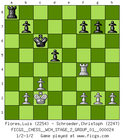 Last move : 1/2-1/2 2022 March 26 16:33:55 [Event "FICGS__CHESS__WCH_STAGE_2_GROUP_01__000024"] [Site "FICGS"] [Date "2022.03.05"] [Round "1"] [White "Flores,Luis"] [Black "Schroeder,Christoph"] [Result "1/2-1/2"] [WhiteElo "2254"] [BlackElo "2247"] 1.e4 e6 2.d4 d5 3.Nc3 dxe4 4.Nxe4 Nd7 5.Nf3 Ngf6 6.Nxf6+ Nxf6 7.c3 c5 8.Ne5 a6 9.Be3 Qc7 10.Qa4+ Nd7 11.Bb5 cxd4 12.Bxd7+ Bxd7 13.Qxd4 Bb5 14.a4 Bd6 15.axb5 Bxe5 16.Qc5 Qxc5 17.Bxc5 Kd7 18.O-O-O Kc7 19.Rhe1 Bf6 20.Bd6+ Kb6 21.bxa6 Rxa6 22.Kc2 Kc6 23.Be5 Bxe5 24.Rxe5 Rha8 25.Rd3 Ra5 26.Re4 Rd5 27.Rc4+ Kd6 28.Rxd5+ exd5 29.Rb4 Kc6 30.Rf4 1/2-1/2 French : Rubinstein variation Queenside Castling by player White (move 18) This chess game ended in a draw. Follow this game move after move (download)There is no remorse like the remorse of Chess. (H. G. Wells) Es gibt nur zwei wahre Schachgenies - das andere war Wilhelm Steinitz, der Weltmeister von 1872 bis 1894. (Robert James Fischer) Hasta este punto, las blancas han seguido un análisis bien conocido. Pero ahora el hace un error fatal: empieza a usar su propia cabeza. (Siegbert Tarrasch) Le pion, dans sa simplicité, marche droit devant lui, mais lorsqu'il prend, il le fait obliquement? Ainsi l'homme, tant qu'il reste pauvre, marche dans la droiture et vit honnêtement, mais lorsqu'il recherche les honneurs, il flatte, se parjure et, par les voies obliques, cherche une position supérieure sur l'échiquier du monde. (Jean de Galles) Art disturbs, science reassures. (Georges Braque, Le Jour et la Nuit)