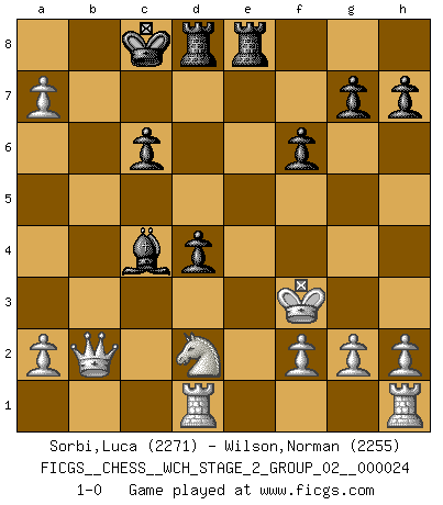 Last move : 1-0 2022 April 10 16:25:11 [Event "FICGS__CHESS__WCH_STAGE_2_GROUP_02__000024"] [Site "FICGS"] [Date "2022.03.05"] [Round "1"] [White "Sorbi,Luca"] [Black "Wilson,Norman"] [Result "1-0"] [WhiteElo "2271"] [BlackElo "2255"] 1.d4 d5 2.c4 e6 3.Nc3 c6 4.e4 dxe4 5.Nxe4 Bb4+ 6.Bd2 Qxd4 7.Bxb4 Qxe4+ 8.Be2 Na6 9.Ba5 b6 10.Qd6 Bd7 11.Bc3 f6 12.Nf3 Nh6 13.Rd1 Nc5 14.b4 Qxe2+ 15.Kxe2 O-O-O 16.bxc5 Nf5 17.Qd2 e5 18.Qb2 Be6 19.Nd2 Nd4+ 20.Bxd4 exd4 21.cxb6 Rhe8 22.bxa7 Bxc4+ 23.Kf3 1-0 QGD : Semi-Slav, Marshall gambit Queenside Castling by player Black (move 15) Player White won this chess game. Follow this game move after move (download)Kasparov : J'adoube , Ivanchuk : S'il vous plaît ! (Garry Kasparov & Vassily Ivanchuk, Linares 1997) Die meiste Zeit treffe ich auf Gegner, die meine Enkel sein könnten. Ich bin da, um ihnen zu zeigen, dass sie von mir noch einiges lernen können. (Viktor Kortschnoi) Nos gusta pensar. (Gary Kasparov) Les échecs c'est le défi de l'alpiniste, toujours plus haut, prêt à tout pour monter à l'assaut du Roi ennemi. Les échecs, c'est de la musique en mouvement, un ballet majestueux pour les yeux. C'est de la poésie composée par les fantômes du passé qui au même titre que Rimbaud ou Verlaine méritent notre admiration. Les échecs, c'est de la peinture ou le moindre mouvement modifie le tableau pour en faire un Picasso ou un Van Gogh. Les échecs, c'est tout et rien, c'est la vie et la mort. Jjulie33 sur le forum de France-Echecs. When you don't know what to do, walk fast and look worried. (Anonymous)