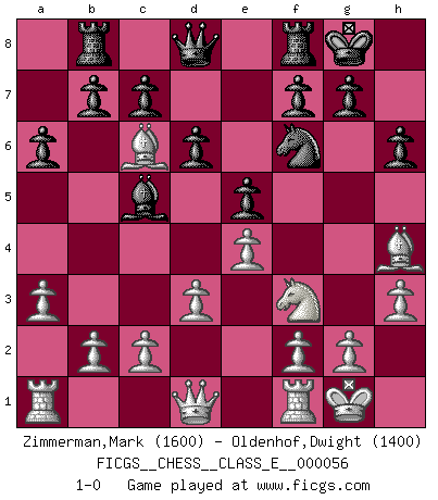 Last move : 1-0 2007 November 15 7:14:6 [Event "FICGS__CHESS__CLASS_E__000056"] [Site "FICGS"] [Date "2007.07.30"] [Round "1"] [White "Zimmerman,Mark"] [Black "Oldenhof,Dwight"] [Result "1-0"] [WhiteElo "1600"] [BlackElo "1400"] 1.e4 e5 2.Nf3 Nc6 3.Bc4 Nf6 4.Nc3 Bc5 5.d3 O-O 6.a3 a6 7.O-O d6 8.Bg5 h6 9.Bh4 Bg4 10.h3 Be6 11.Nd5 Bxd5 12.Bxd5 Rb8 13.Bxc6 1-0 This chess game has been lost on time (started : 2007.07.30 11:9:57) Two knights defense Kingside Castling by player Black (move 5) Kingside Castling by player White (move 7) Player White won this chess game. Follow this game move after move (download)I won't play with you anymore. You have insulted my friend. - When an opponent cursed himself for a blunder. (Miguel Najdorf) Nach Morphy wurde nichts neues mehr in der Behandlung offener Positionen gefunden. (Mikhail Moiseyevich Botvinik) Las combinaciones han sido siempre el aspecto más intrigante del Ajedrez. Los Maestros las buscan, el público las aplauden, los críticos las alaban. La razón se debe a que las combinaciones hacen posible que el Ajedrez sea más que un ejercicio matemático con una carencia de vida. Ellas son la poesía del juego, son del Ajedrez lo que la melodía es de la música. Ellas representan el triunfo de la mente sobre la materia. (Reuben Fine) Il s'avisa de me proposer d'apprendre les échecs qu'il jouait un peu... me voilà forcené des échecs. J'achète un échiquier, je m'enferme dans ma chambre, j'y passe des jours et des nuits à vouloir apprendre par cur toutes les parties. (Jean-Jacques Rousseau, Confessions) It's not the size of the dog in the fight, it's the size of the fight in the dog. (Mark Twain)